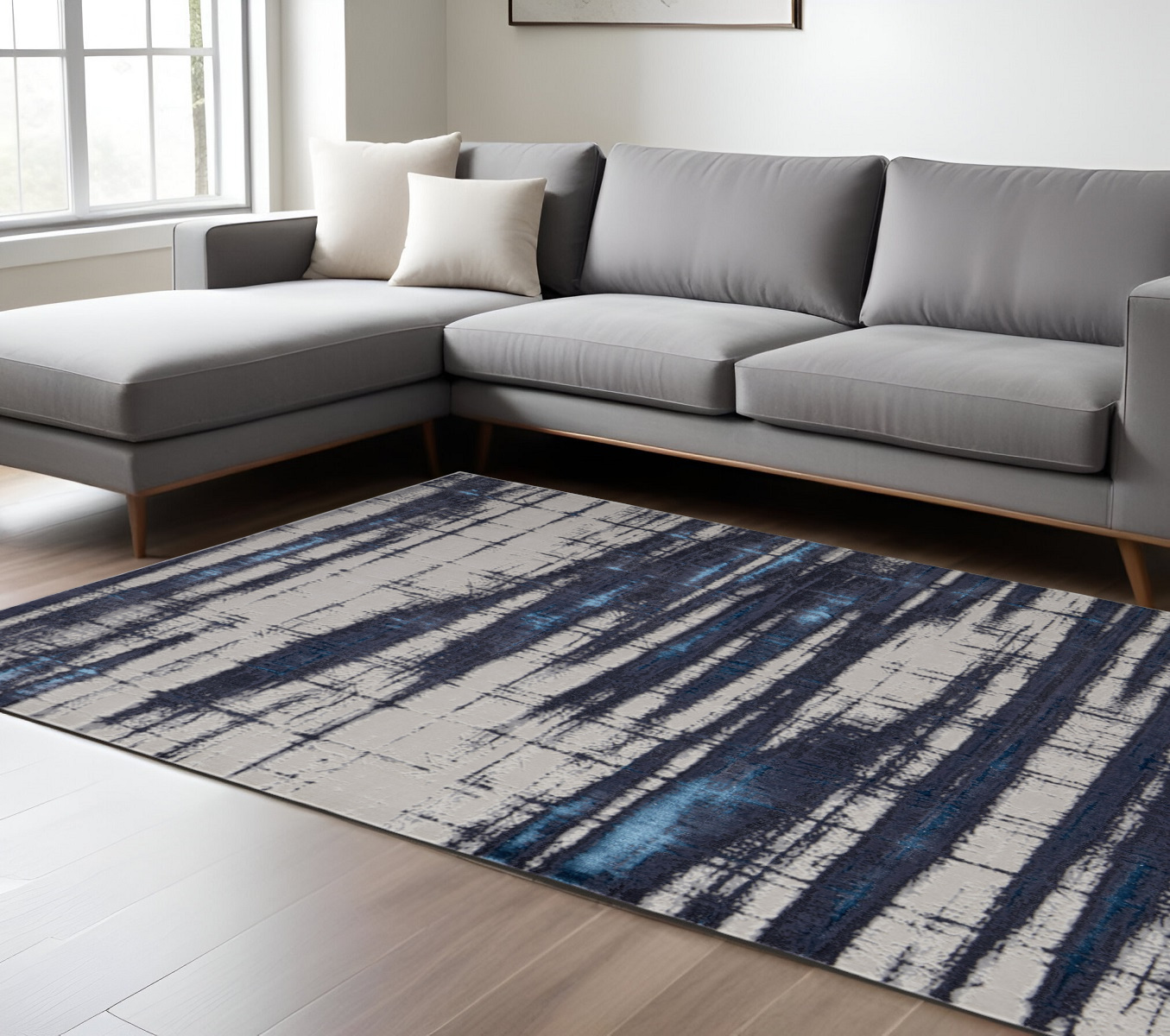 Set an inviting tone in your space with this 7-foot x 10-foot ivory and blue abstract power loom distressed non skid area rug. This rectangle shaped rug features a abstract design in ivory and blue to give it visual interest. A classic shape marries with good looking design for your space. 79-inch H x 114-inch W x 0.39-inch D