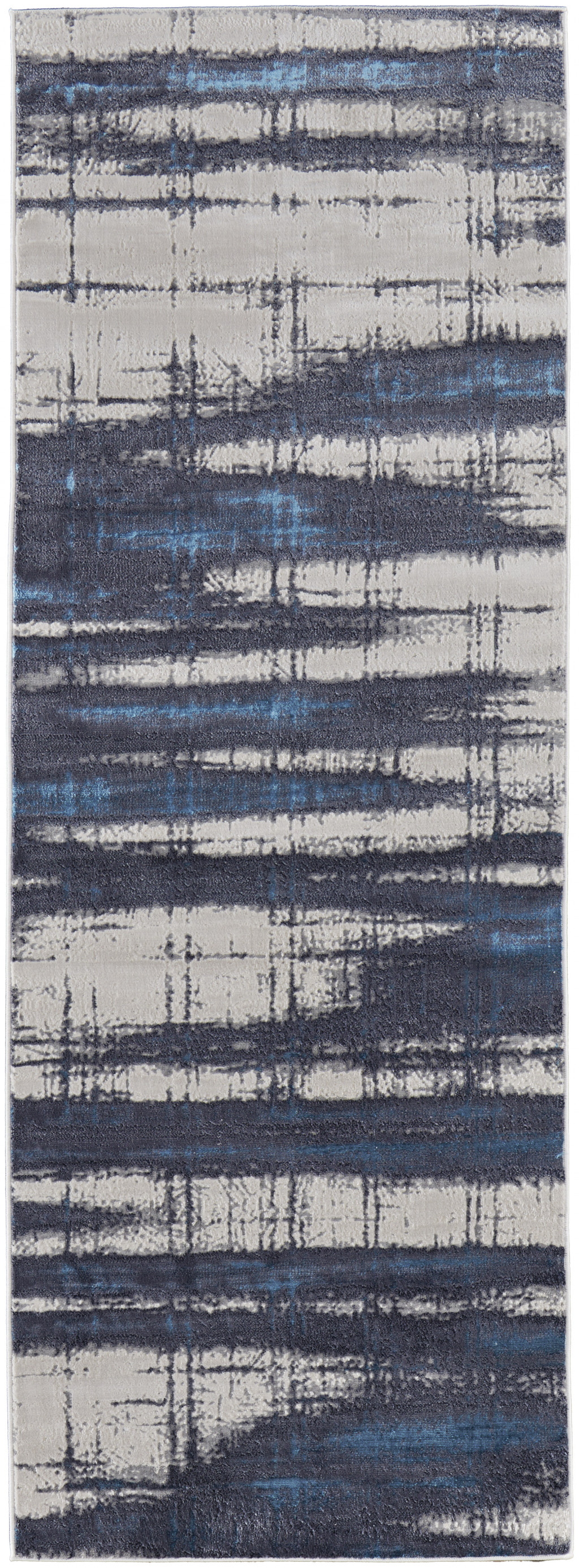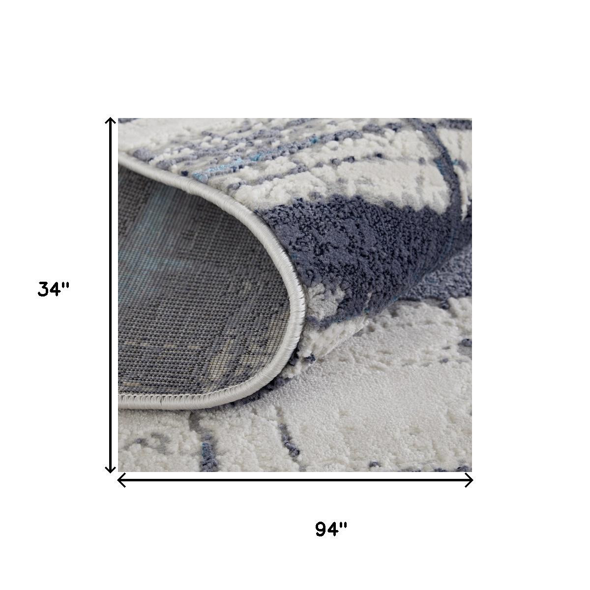 Add great coloration and comfortable texture to your space with this 8' ivory blue and gray abstract power loom distressed runner rug. This runner shaped rug features a abstract design in ivory blue and gray to give it visual interest. A classic shape marries with good looking design for your space This superior Turkish rug represents the highest quality and is built to last. Place this area rug against a hardwood or tile floor and it will enliven your living space with style and sophistication. 0.39" H x 34" W x 94" D