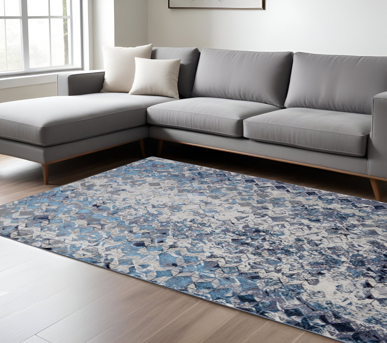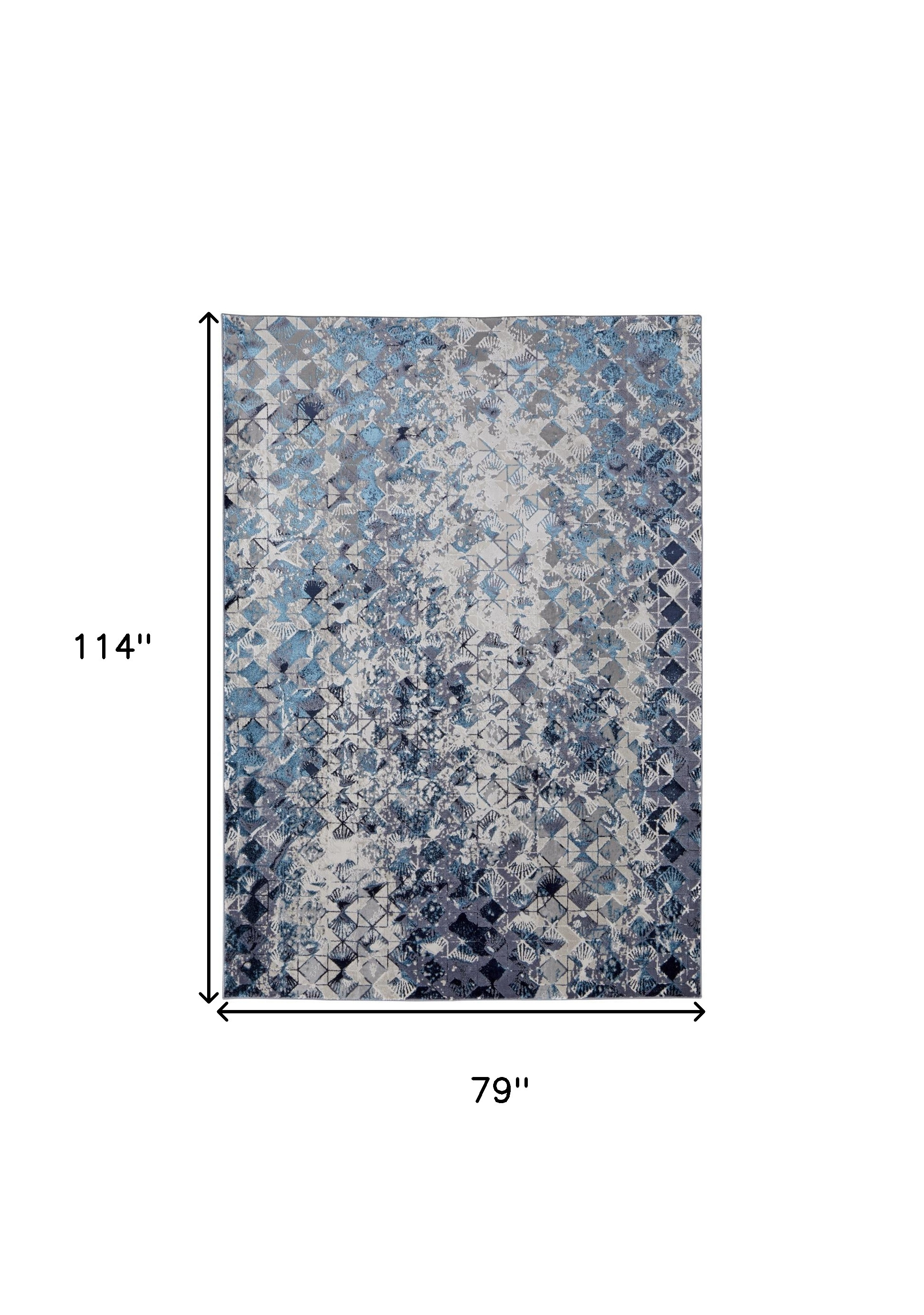 This 7-foot x 10-foot blue ivory and gray geometric distressed area rug, is a great way to add warmth to a room. Built to last, this rug crafted from polyester fibers is known for its durability and long lasting appeal. Rugs are a great way to showcase your style, hide imperfections, warm your home and reduce noise. 79.00-inch h x 114.00-inch w x 0.39-inch d.