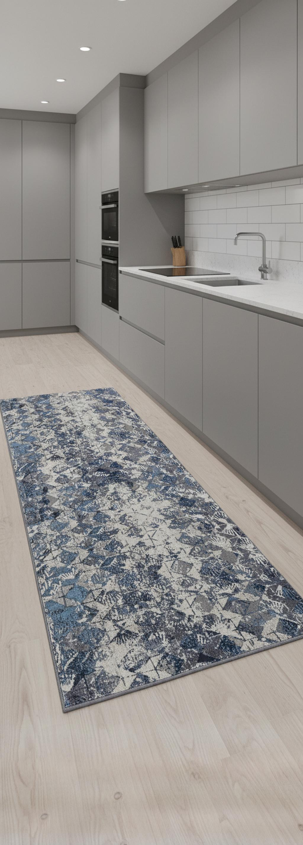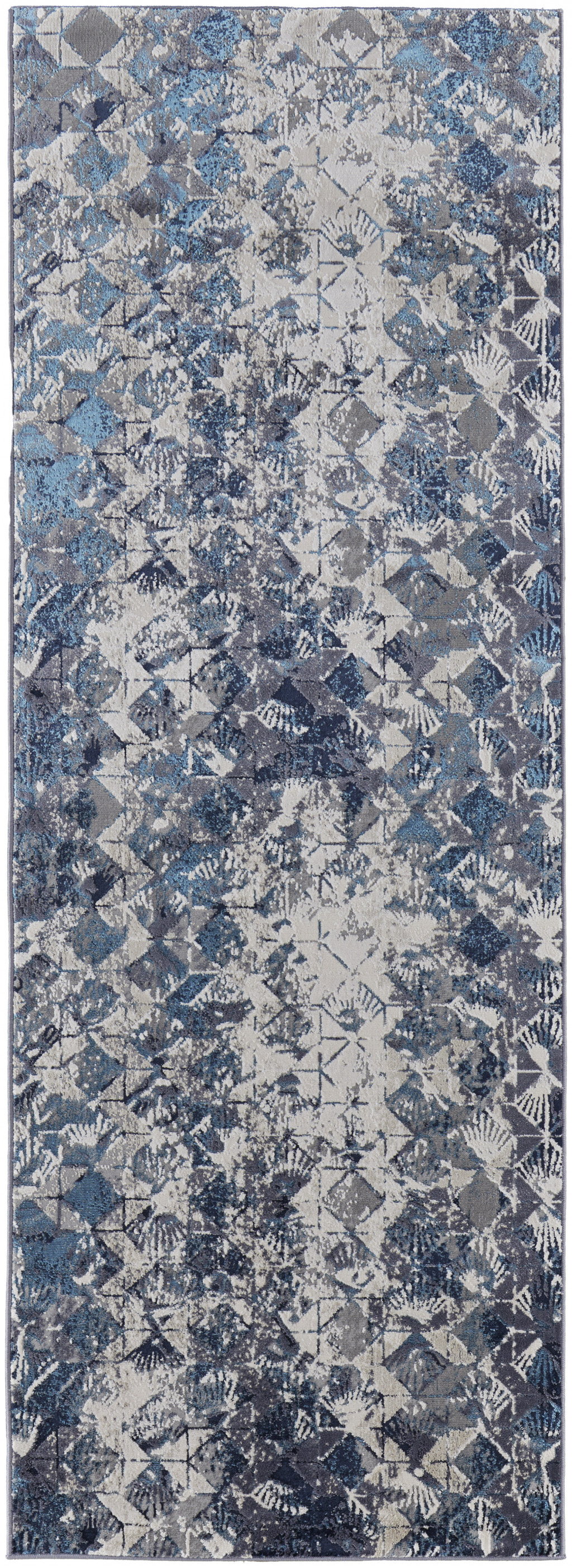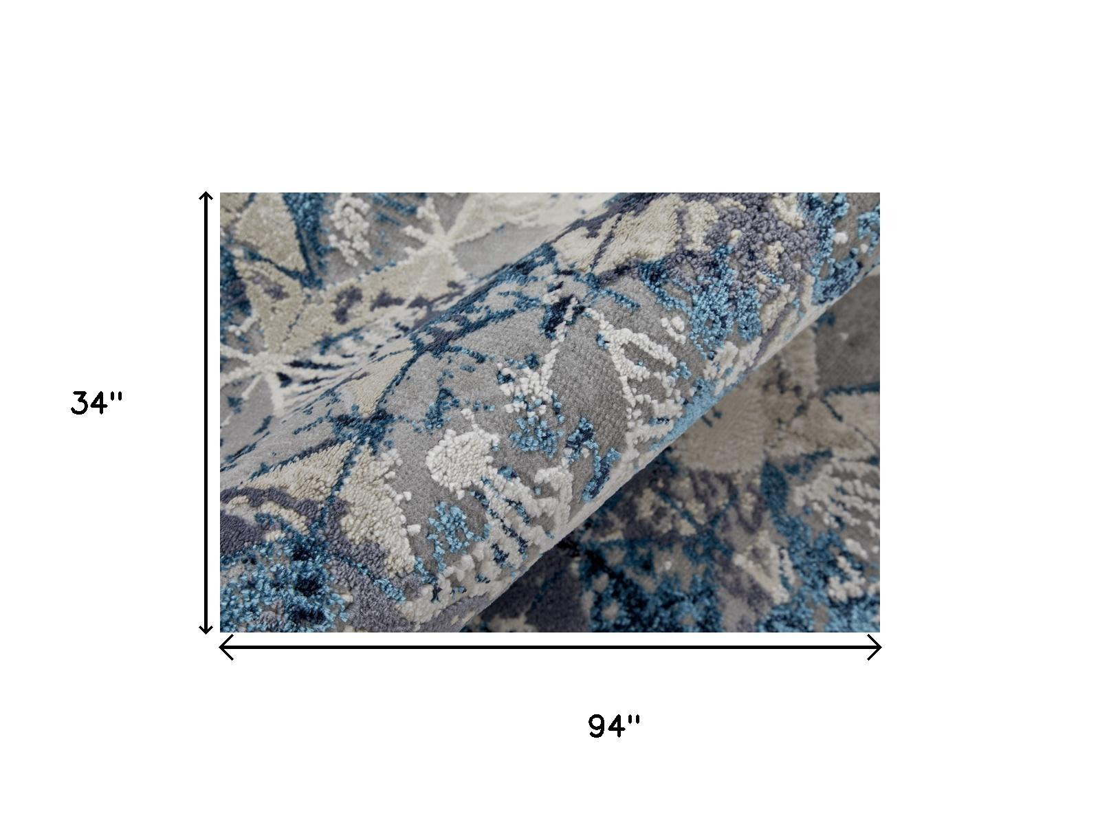 Set an inviting tone in your space with this 8-foot blue ivory and gray geometric distressed runner rug. Built to last, this rug crafted from polyester fibers is known for its durability and long lasting appeal. Rugs are a great way to showcase your style, hide imperfections, warm your home and reduce noise. 34.00-inch h x 94.00-inch w x 0.39-inch d.