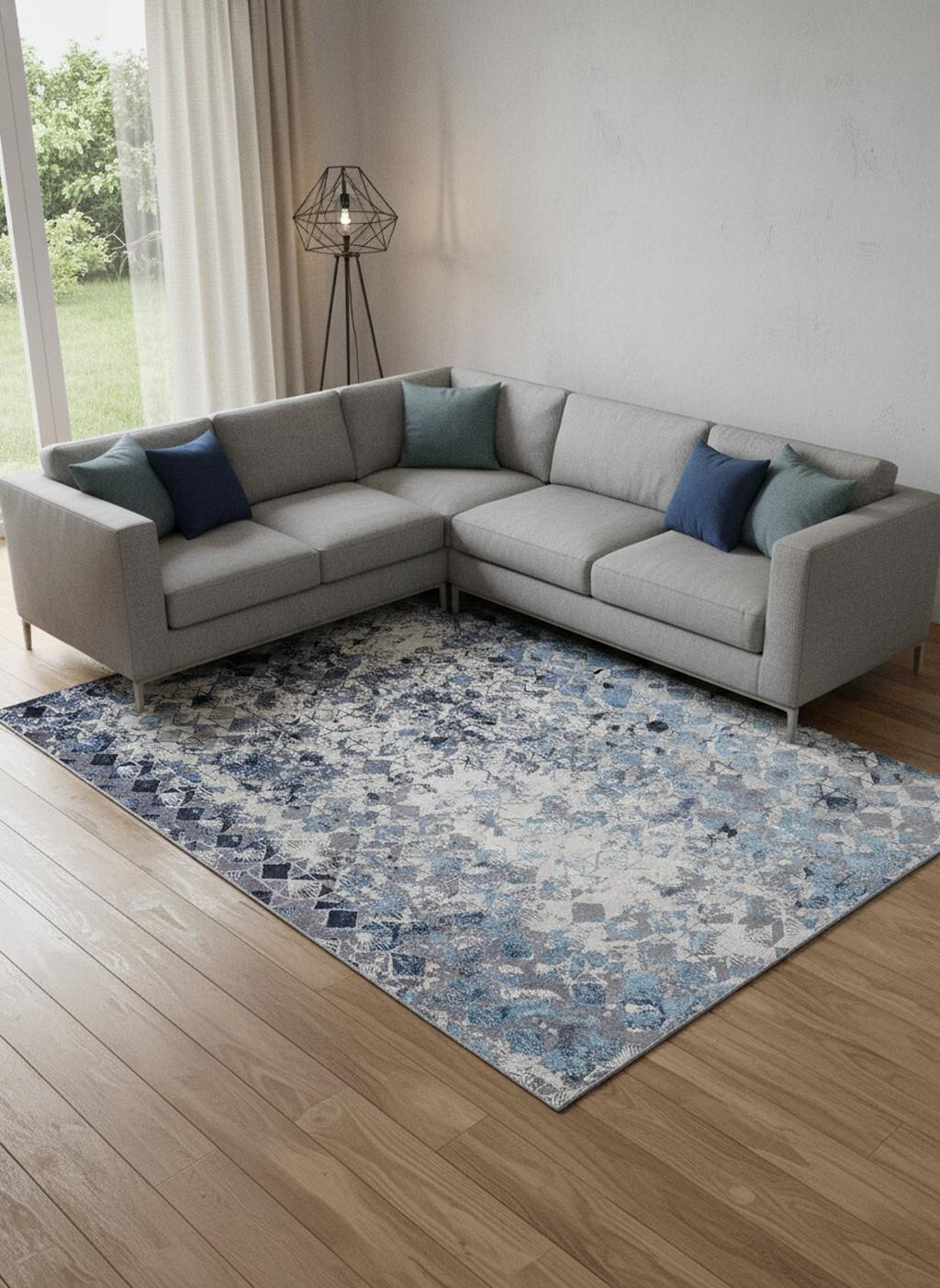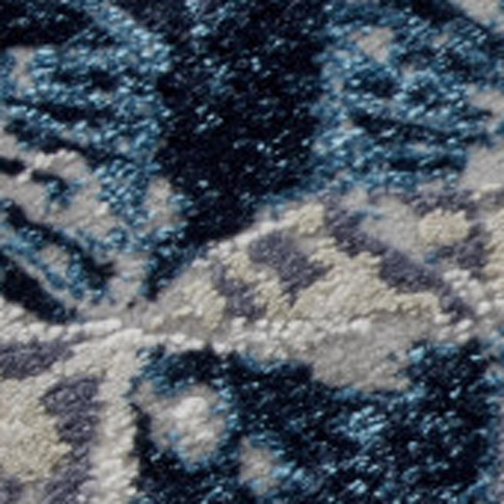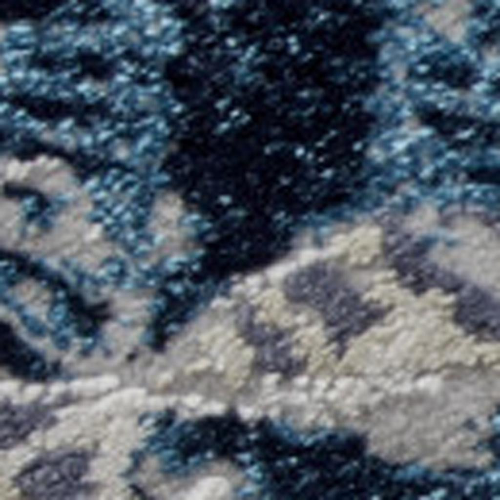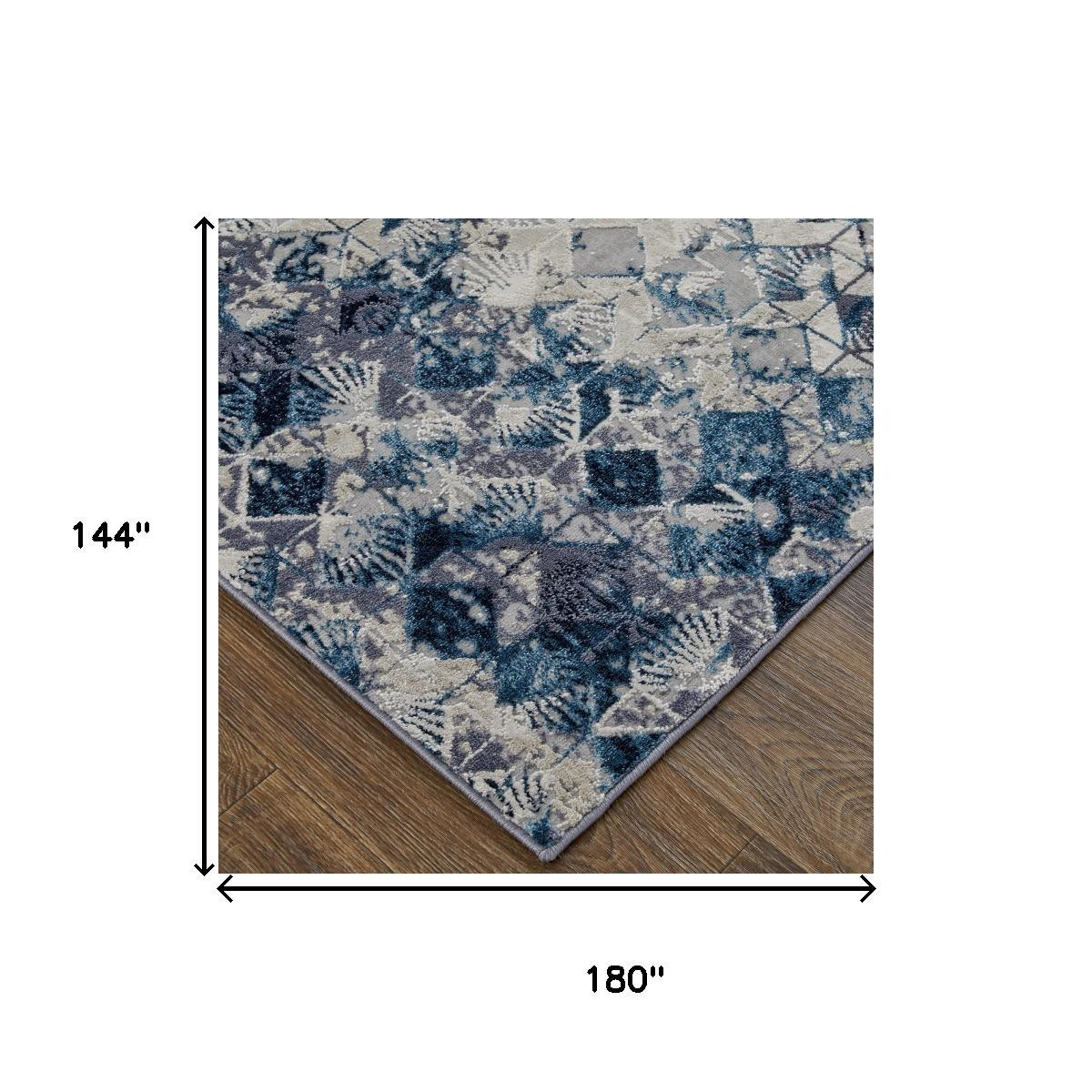 This 12-foot x 15-foot blue ivory and gray geometric distressed area rug, is a great way to add warmth to a room. Built to last, this rug crafted from polyester fibers is known for its durability and long lasting appeal. Rugs are a great way to showcase your style, hide imperfections, warm your home and reduce noise. 144.00-inch h x 180.00-inch w x 0.39-inch d.