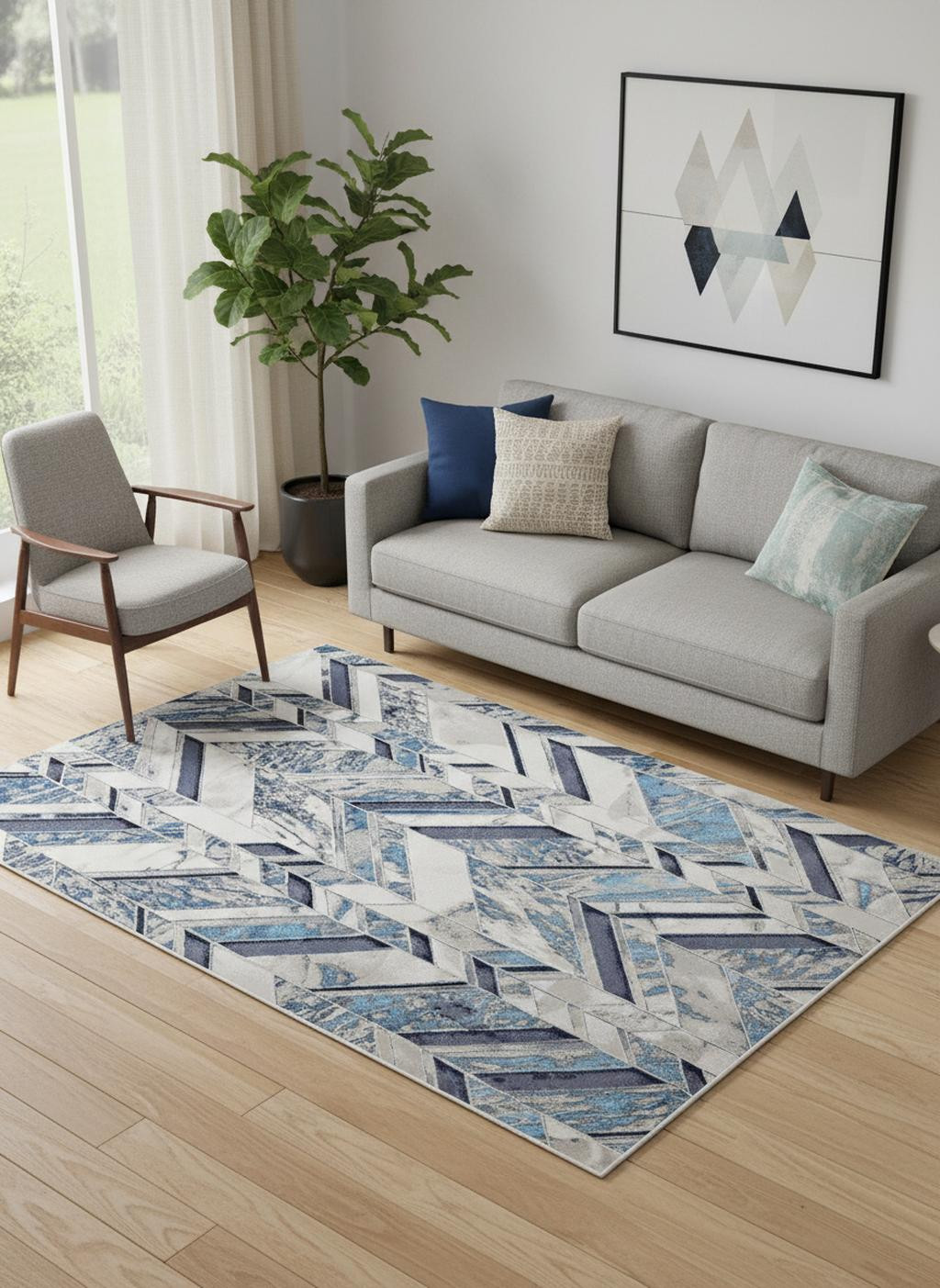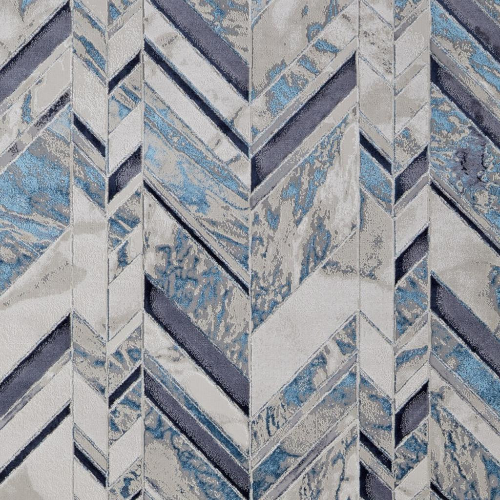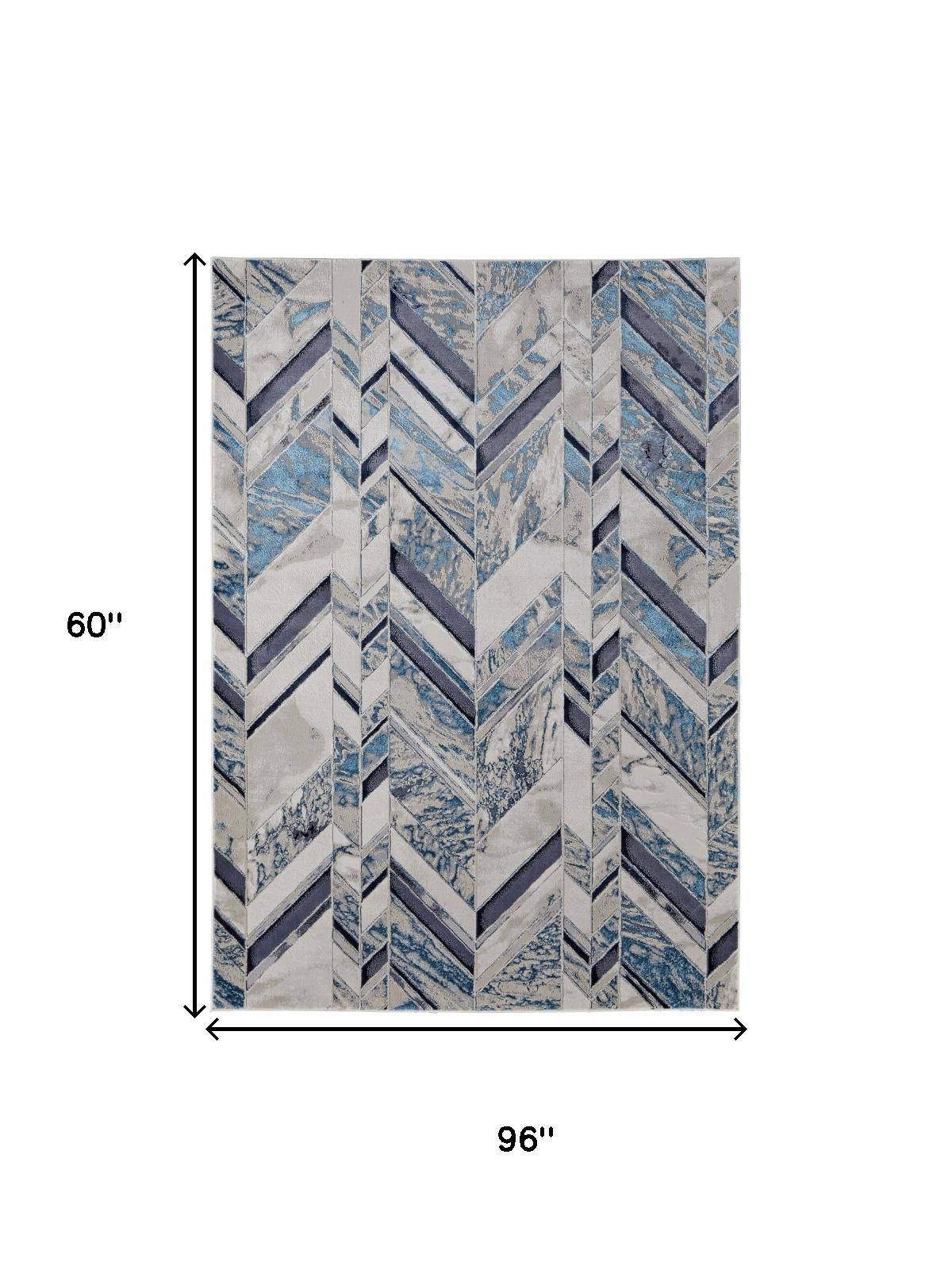 Add some artistry to your room with this 5' x 8' ivory blue and gray chevron power loom distressed area rug. This rectangle shaped rug features a chevron design in ivory blue and gray to give it visual interest. A classic shape marries with good looking design for your space This superior Turkish rug represents the highest quality and is built to last. Area Rugs help to give warmth and sense of home to your space. 0.39" H x 60" W x 96" D