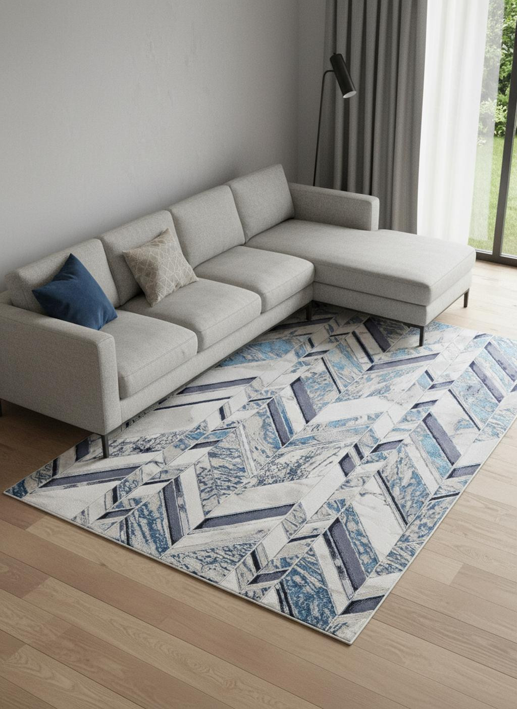 This 9' x 12' ivory blue and gray chevron power loom distressed area rug, is a great way to add warmth to a room. This rectangle shaped rug features a chevron design in ivory blue and gray to give it visual interest. A classic shape marries with good looking design for your space This superior Turkish rug represents the highest quality and is built to last. Area Rugs help to give warmth and sense of home to your space. 0.39" H x 110" W x 144" D