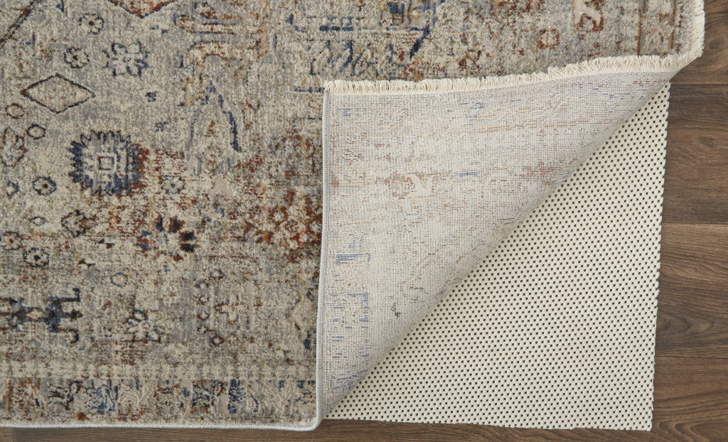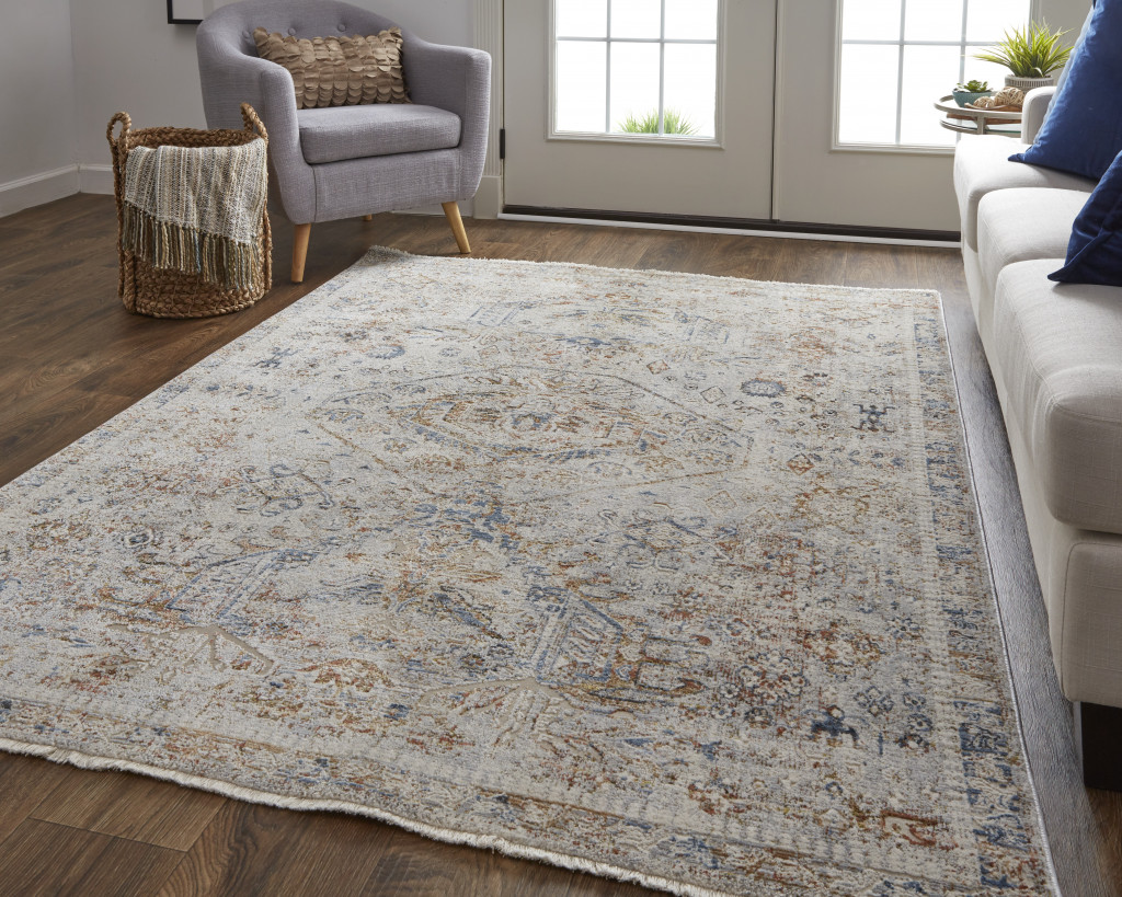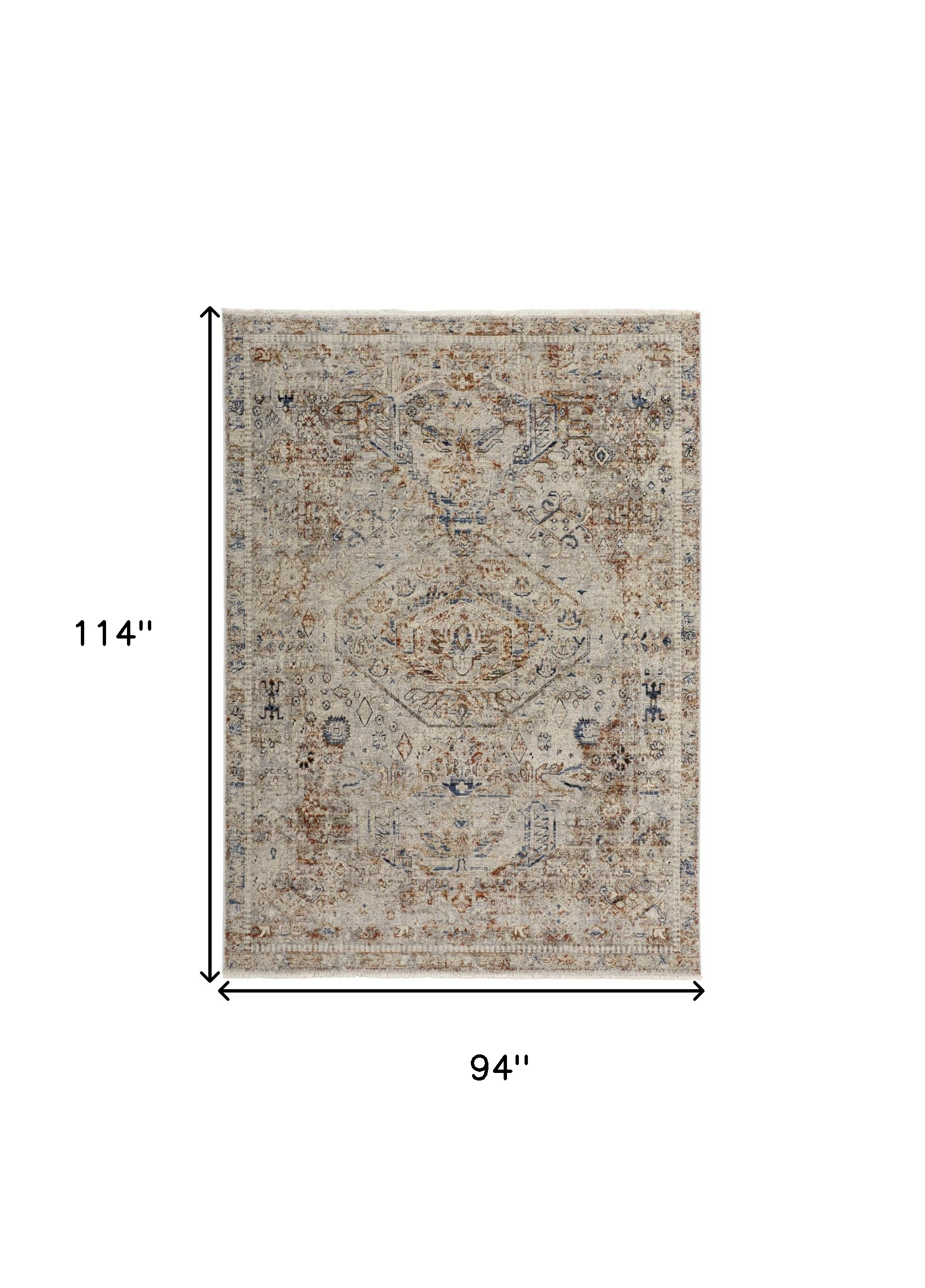 Add some artistry to your room with this 8-foot x 10-foot blue tan and red oriental distressed area rug with fringe. Built to last, this rug crafted from polypropylene fibers is known for its durability and long lasting appeal. Rugs are a great way to showcase your style, hide imperfections, warm your home and reduce noise. Tassel ends bring a timeless and fashionable look to your interior. 94.00-inch h x 114.00-inch w x 0.39-inch d.
