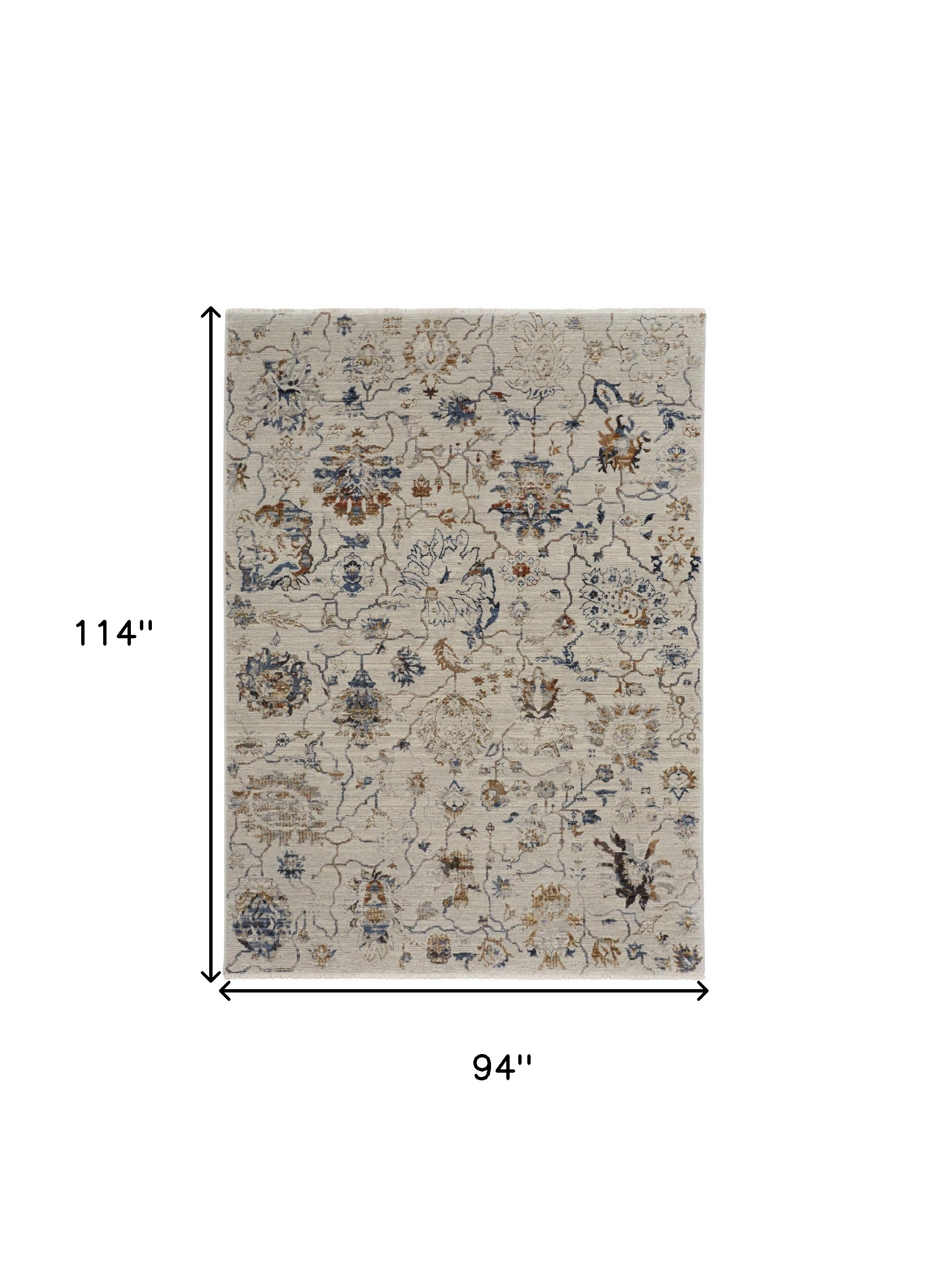 This 8-foot x 10-foot ivory blue and burnt orange floral distressed area rug with fringe, is a great way to add warmth to a room. Built to last, this rug crafted from polypropylene fibers is known for its durability and long lasting appeal. Rugs are a great way to showcase your style, hide imperfections, warm your home and reduce noise. Tassel ends bring a timeless and fashionable look to your interior. 94.00-inch h x 114.00-inch w x 0.39-inch d.