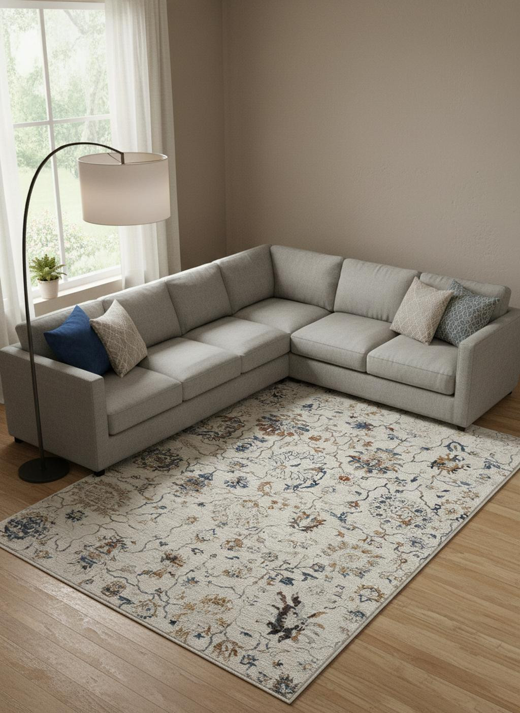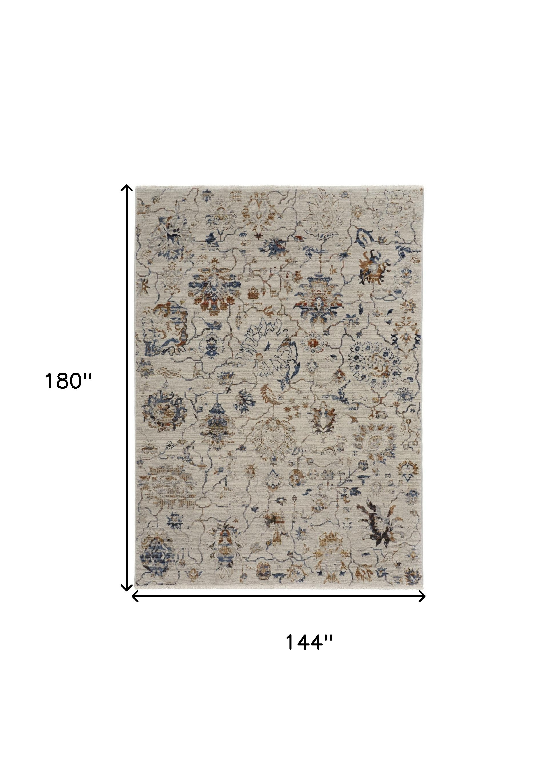 This 12-foot x 15-foot ivory blue and burnt orange floral distressed area rug with fringe, is a great way to add warmth to a room. Built to last, this rug crafted from polypropylene fibers is known for its durability and long lasting appeal. Rugs are a great way to showcase your style, hide imperfections, warm your home and reduce noise. Tassel ends bring a timeless and fashionable look to your interior. 144.00-inch h x 180.00-inch w x 0.39-inch d.