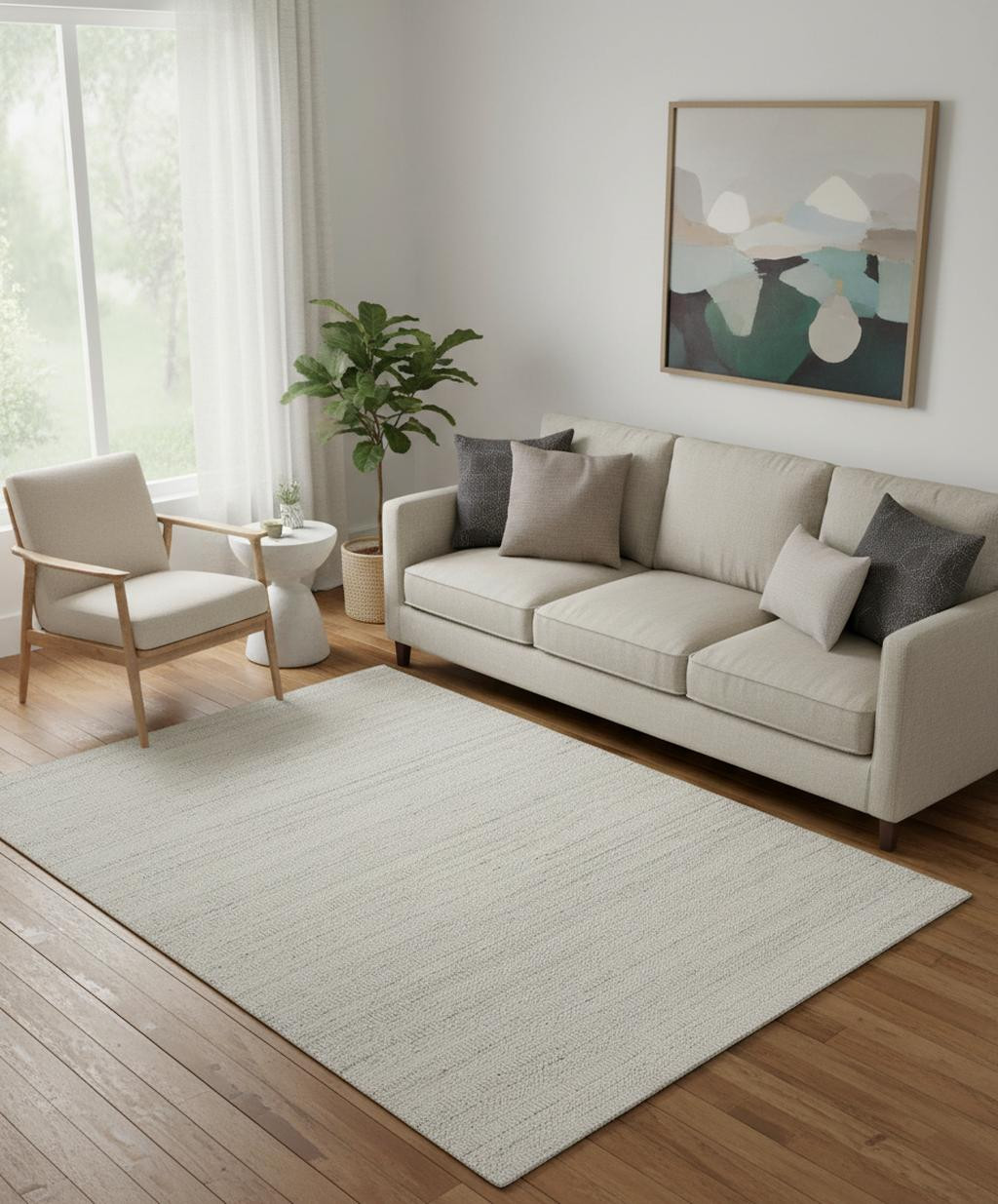 Set an inviting tone in your space with this 5' x 8' ivory and gray wool hand woven stain resistant area rug. This rectangle shaped rug flaunts a ivory and gray color that will be a great way to accent your space. Solid colors are versatile and will blend with any existing decor style. Ideal for spaces with kids and pets, this rug is stain resistant to help repel stains and spilled liquids. Crafted by skilled artisans, this hand woven rug is genuine and unique. No two will be exactly alike. Place this area rug against a hardwood or tile floor and it will enliven your living space with style and sophistication. 0.4" H x 60" W x 96" D