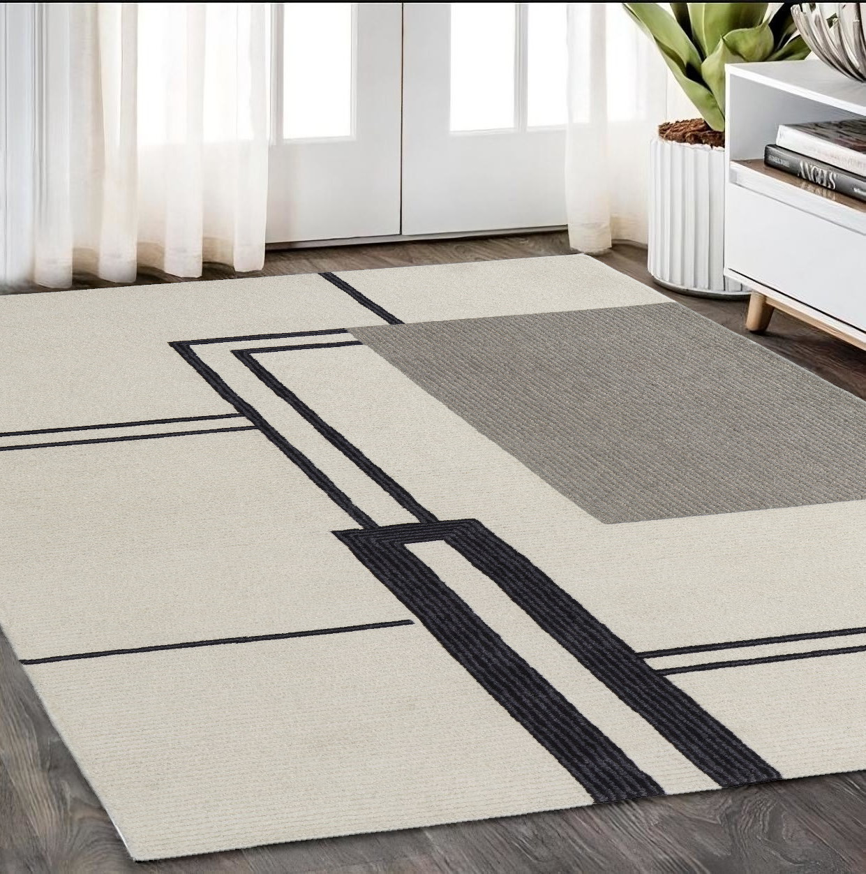 Add some artistry to your room with this 5-foot x 8-foot gray and ivory wool abstract geometric hand tufted area rug. This rectangle shaped rug features a abstract geometric design in gray and ivory to give it visual interest. A classic shape marries with good looking design for your space area rugs help to give warmth and sense of home to your space. 60-inch H x 96-inch W x 0.59-inch D