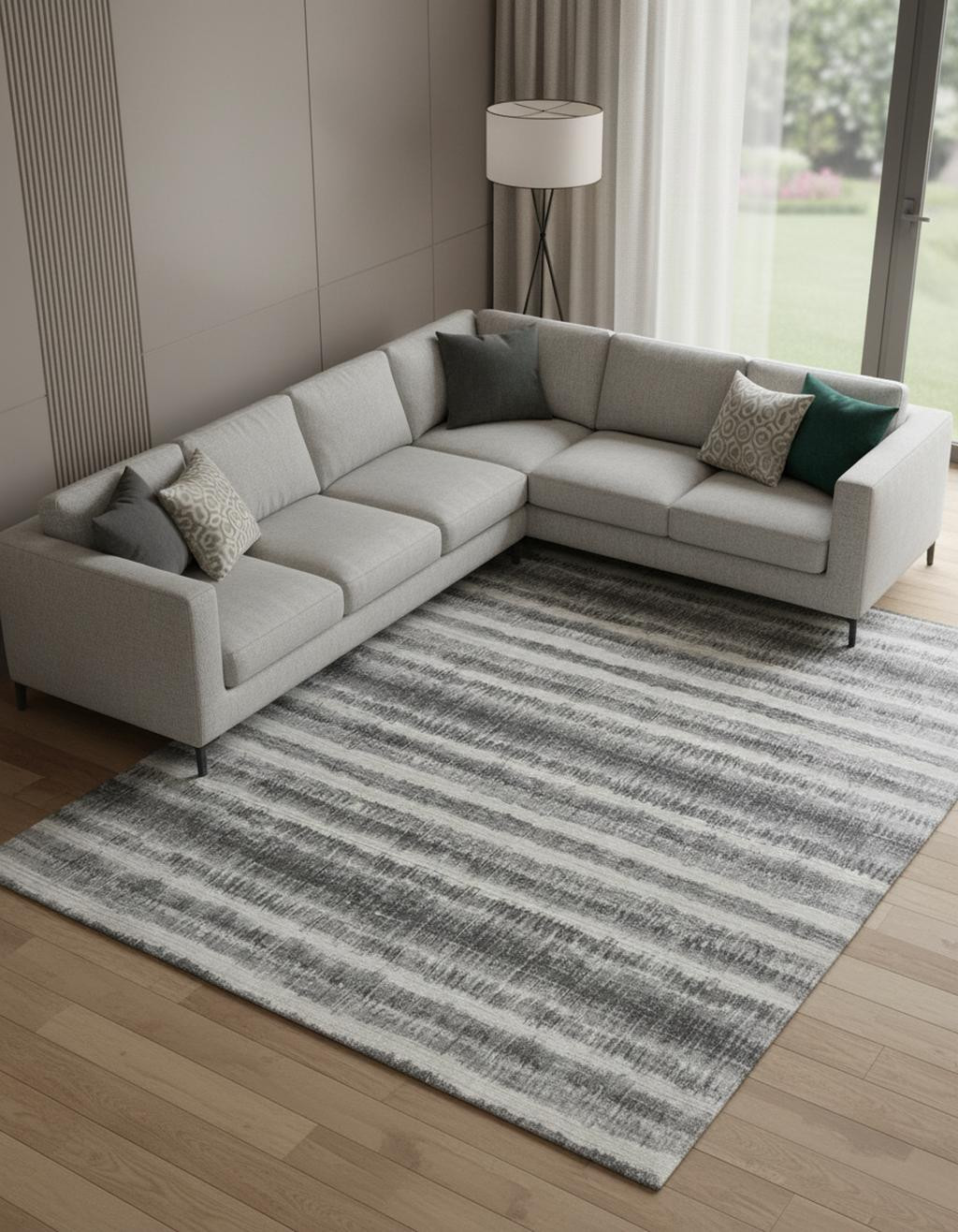 This 8' x 10' gray ivory and black abstract hand woven area rug, is a great way to add warmth to a room. This rectangle shaped rug features a abstract design in gray ivory and black to give it visual interest. A classic shape marries with good looking design for your space Crafted by skilled artisans, this hand woven rug is genuine and unique. No two will be exactly alike. Place this area rug against a hardwood or tile floor and it will enliven your living space with style and sophistication. 0.4" H x 96" W x 120" D