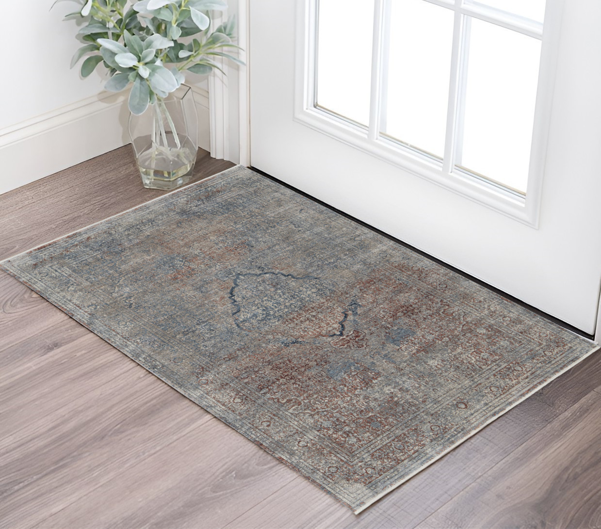 Add some artistry to your room with this 2-foot x 3-foot blue red and gray floral area rug. Ideal for spaces with kids and pets, this rug is stain resistant to help repel dirt and spilled liquids. Built to last, this rug crafted from polyester fibers is known for its durability and long lasting appeal. Rugs are a great way to showcase your style, hide imperfections, warm your home and reduce noise. 24.00-inch h x 36.00-inch w x 0.25-inch d.