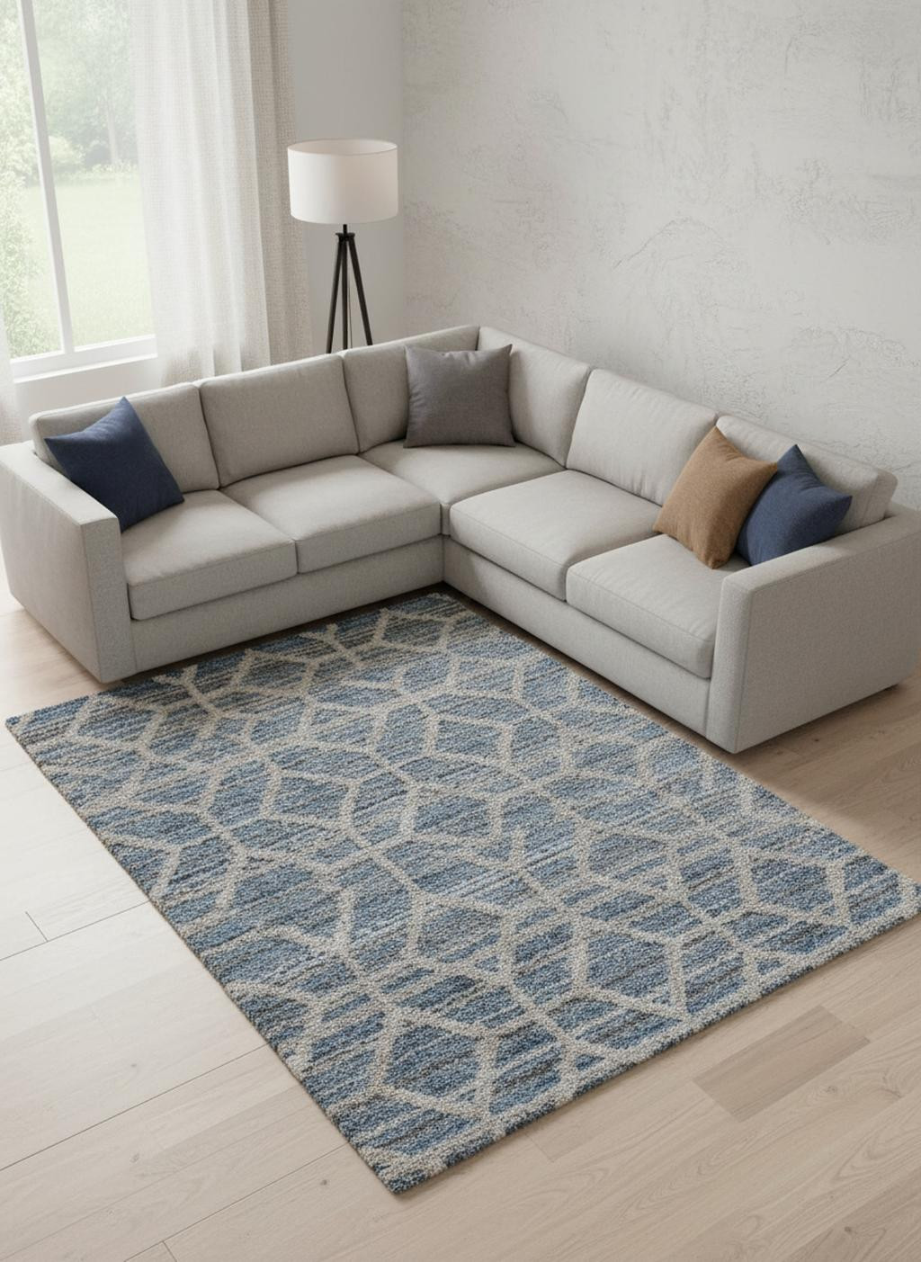 This 9' x 12' blue and ivory geometric power loom stain resistant area rug, is a great way to add warmth to a room. This rectangle shaped rug features a geometric design in blue and ivory to give it visual interest. A classic shape marries with good looking design for your space This superior Turkish rug represents the highest quality and is built to last. Ideal for spaces with kids and pets, this rug is stain resistant to help repel stains and spilled liquids. Area Rugs help to give warmth and sense of home to your space. 1.29" H x 108" W x 144" D