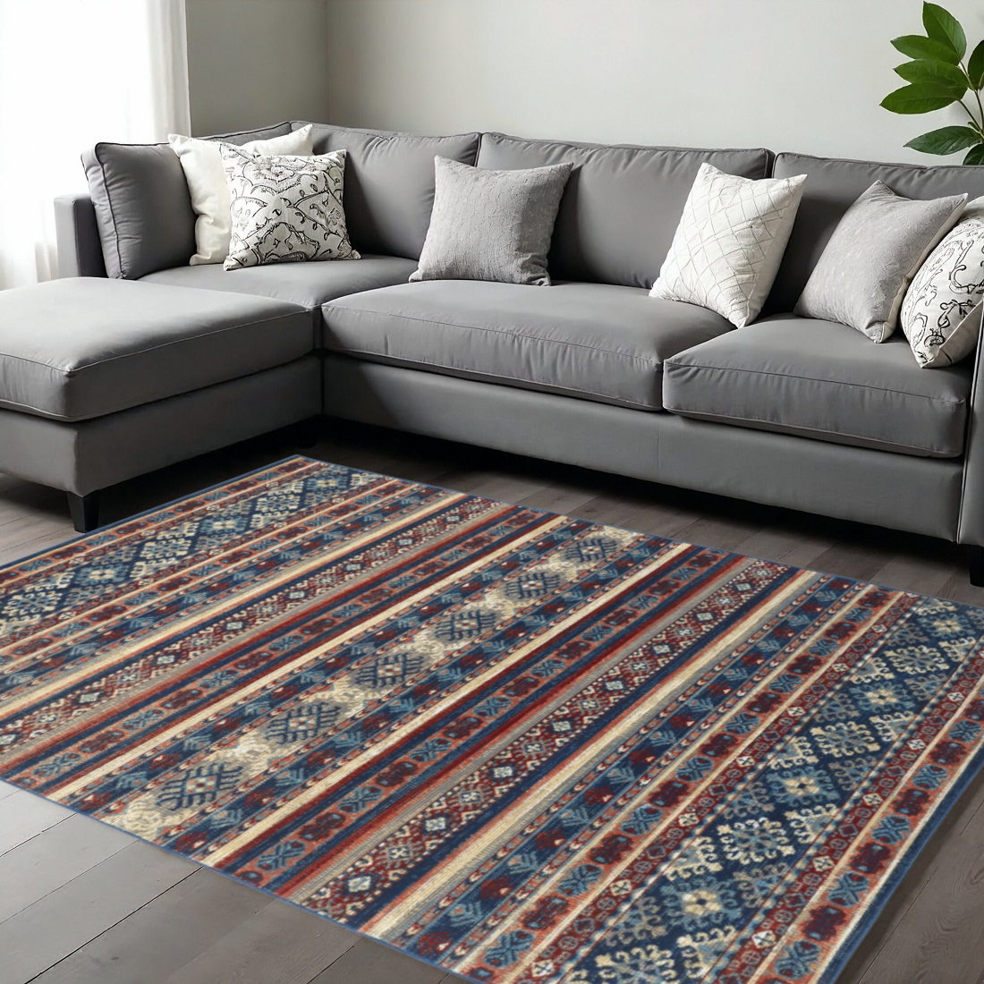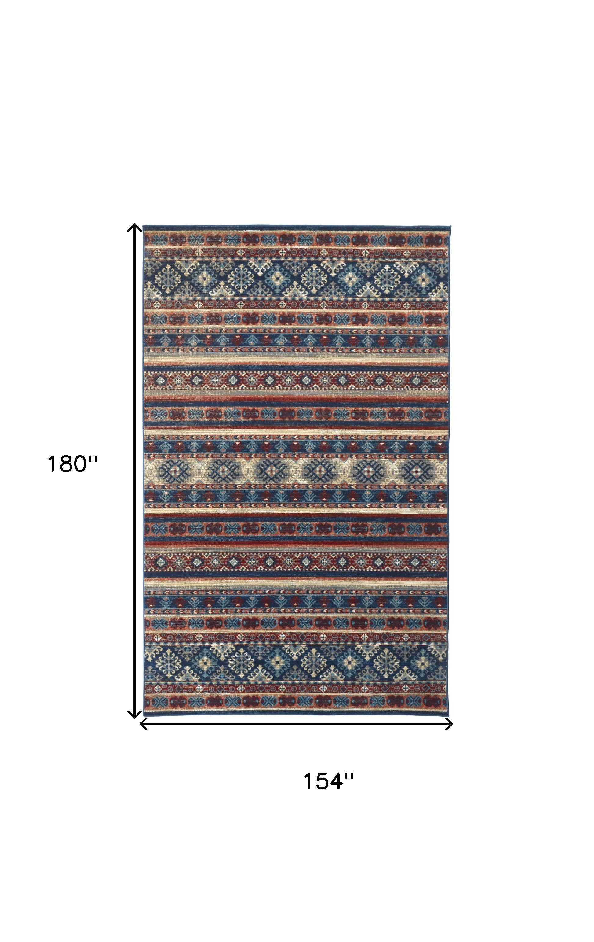 This 13-foot x 15-foot blue red and ivory geometric distressed area rug, is a great way to add warmth to a room. Ideal for spaces with kids and pets, this rug is stain resistant to help repel dirt and spilled liquids. Built to last, this rug crafted from polypropylene fibers is known for its durability and long lasting appeal. Rugs are a great way to showcase your style, hide imperfections, warm your home and reduce noise. This larger sized, transitional styled rug is ready to create a focal point or statement piece in your room. 154.00-inch h x 180.00-inch w x 0.14-inch d.