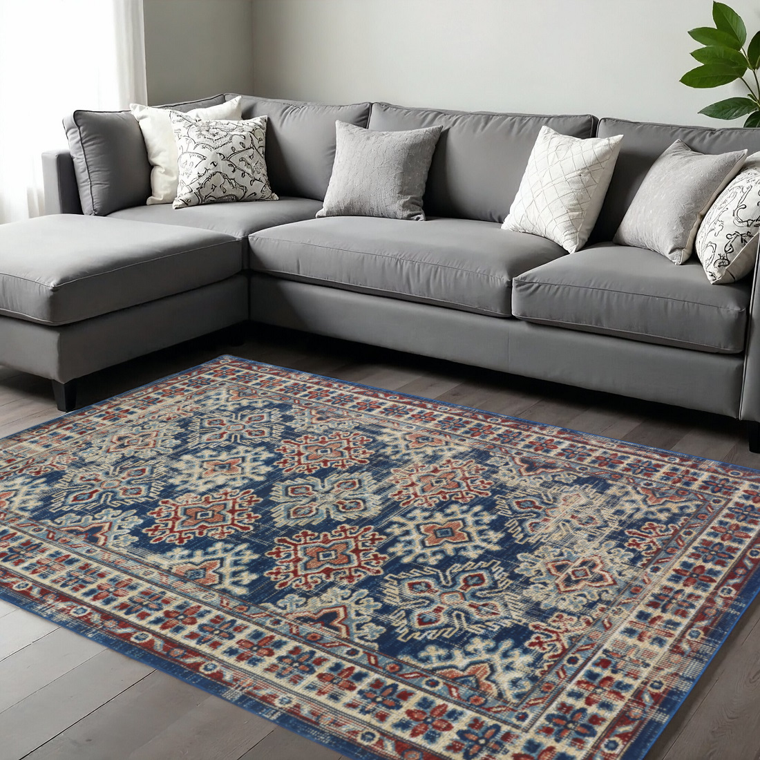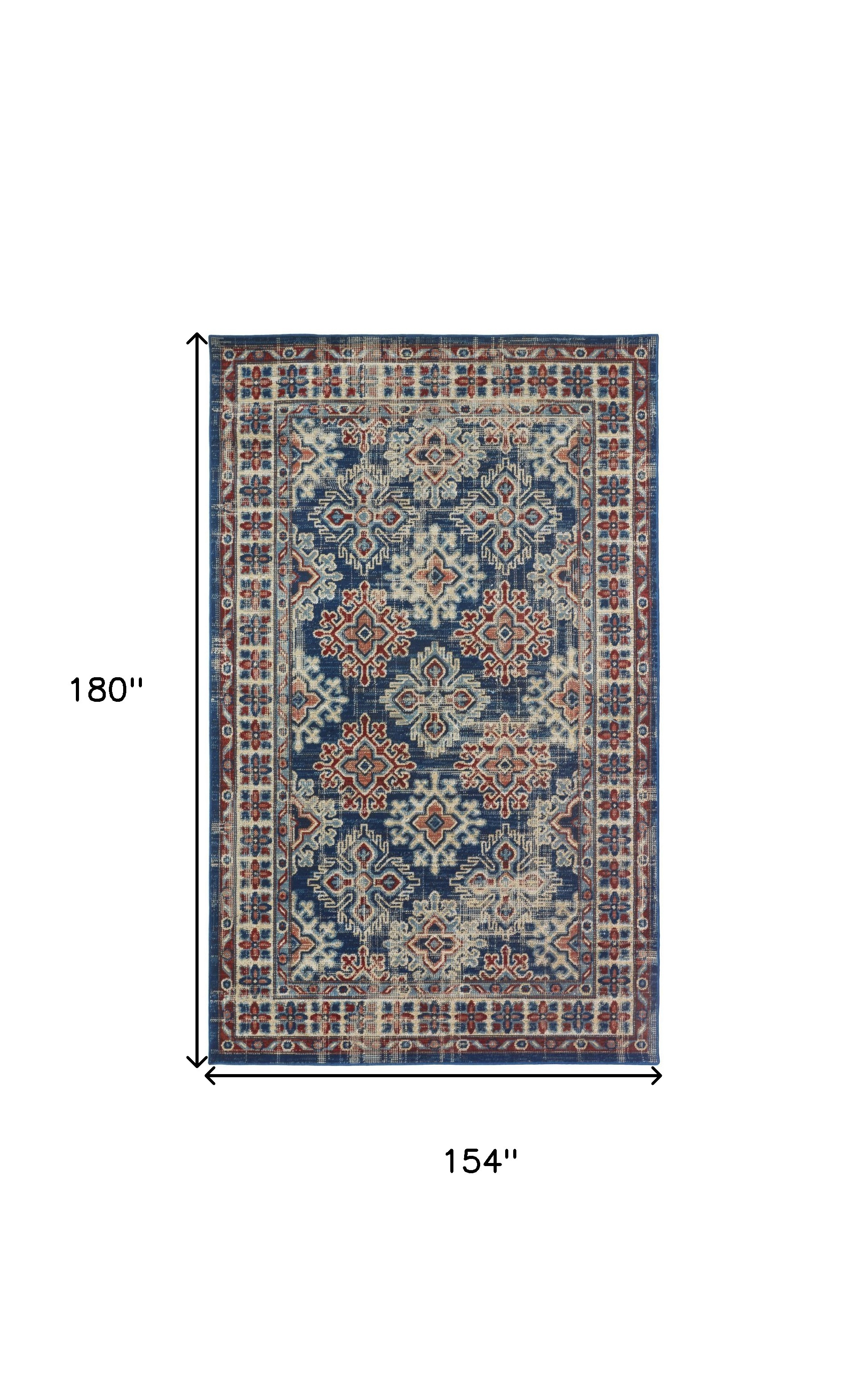 Add some artistry to your room with this 13-foot x 15-foot blue red and ivory southwestern distressed area rug. Ideal for spaces with kids and pets, this rug is stain resistant to help repel dirt and spilled liquids. Built to last, this rug crafted from polypropylene fibers is known for its durability and long lasting appeal. Rugs are a great way to showcase your style, hide imperfections, warm your home and reduce noise. This larger sized, transitional styled rug is ready to create a focal point or statement piece in your room. 154.00-inch h x 180.00-inch w x 0.14-inch d.