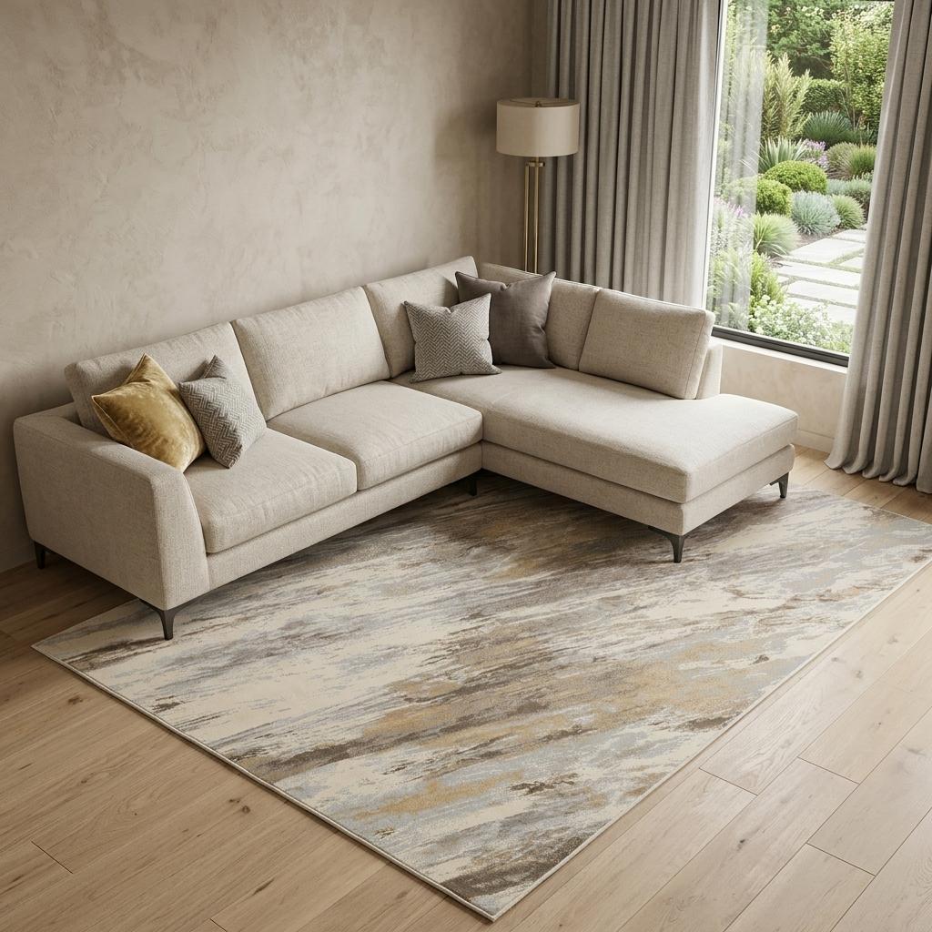 This 9' x 12' ivory tan and brown abstract area rug, is a great way to add warmth to a room. This rectangle shaped rug features a abstract design in ivory tan and brown to give it visual interest. A classic shape marries with good looking design for your space Made in Turkey, this rug offers high quality combined with good looking designer sensibilities. Area Rugs help to give warmth and sense of home to your space. 0.39" H x 108" W x 144" D