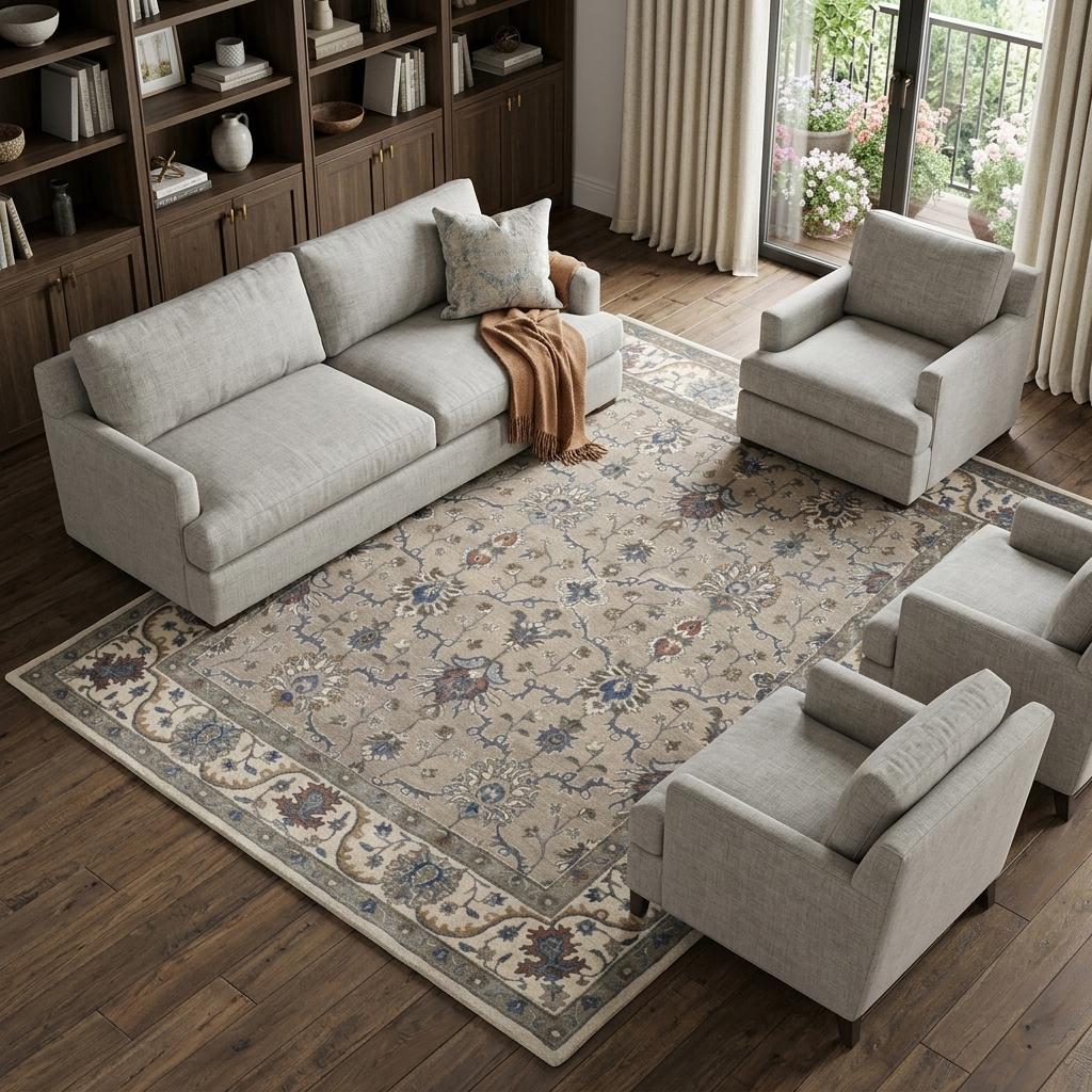 handmade stain resistant area rug, stain resistant area rug, resistant area rug, taupe ivory blue wool floral, wool floral tufted handmade stain |