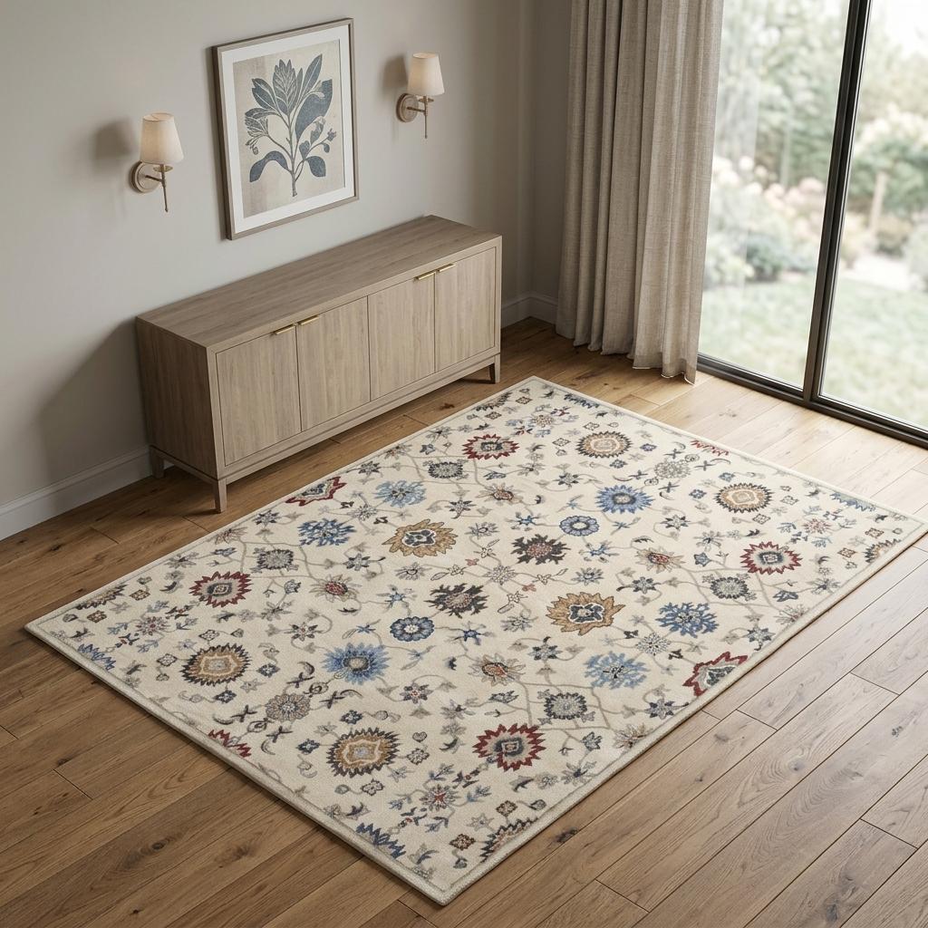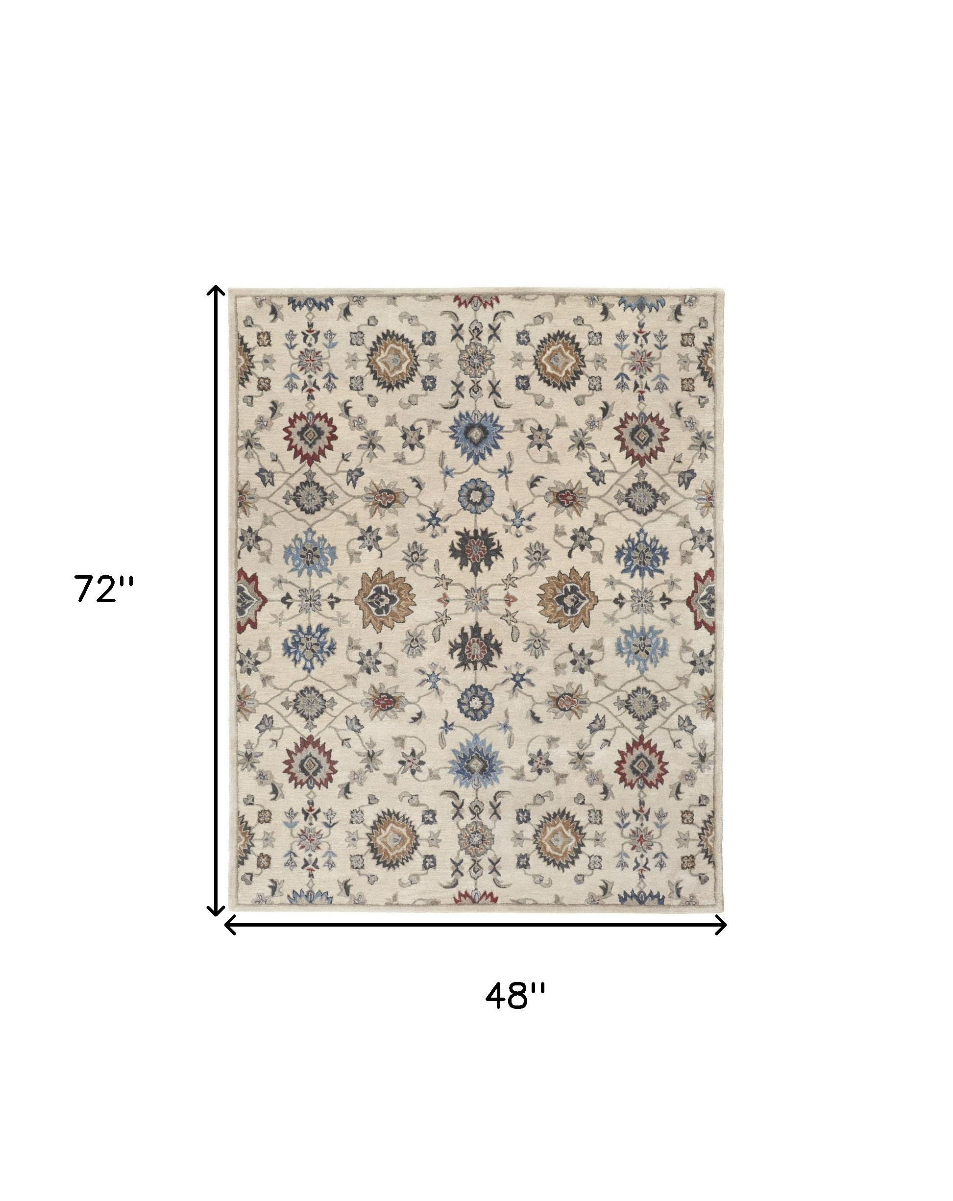 This 4-foot x 6-foot ivory and blue wool floral hand tufted area rug, is a great way to add warmth to a room. This rectangle shaped rug features a floral design in ivory and blue to give it visual interest. A classic shape marries with good looking design for your space ideal for spaces with kids and pets, this rug is stain resistant to help repel stains and spilled liquids. Area rugs help to give warmth and sense of home to your space. 48-inch H x 72-inch W x 0.68-inch D