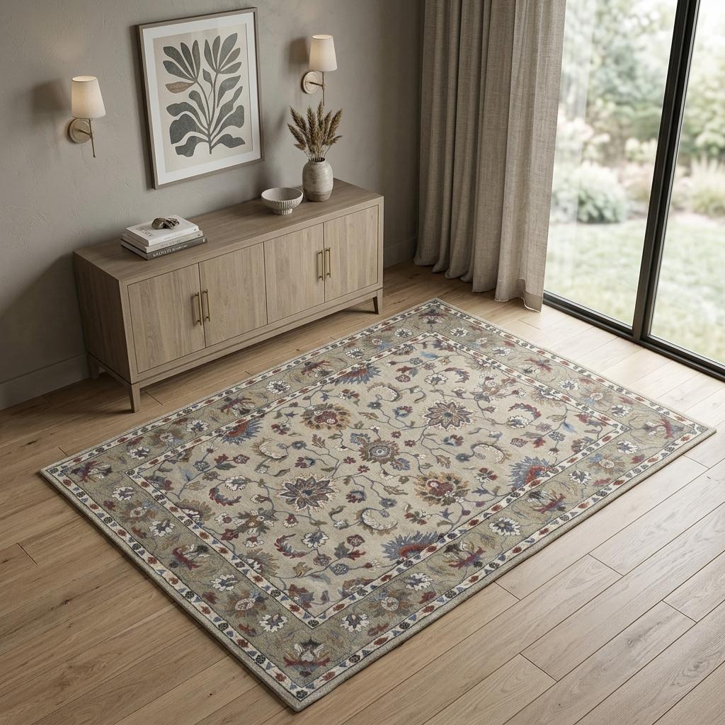 handmade stain resistant area rug, stain resistant area rug, resistant area rug, ivory taupe blue wool floral, wool floral tufted handmade stain |