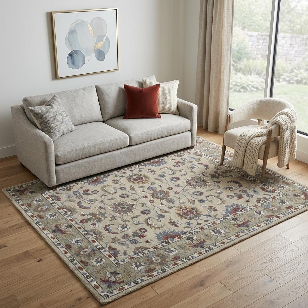 handmade stain resistant area rug, stain resistant area rug, resistant area rug, ivory taupe blue wool floral, wool floral tufted handmade stain |
