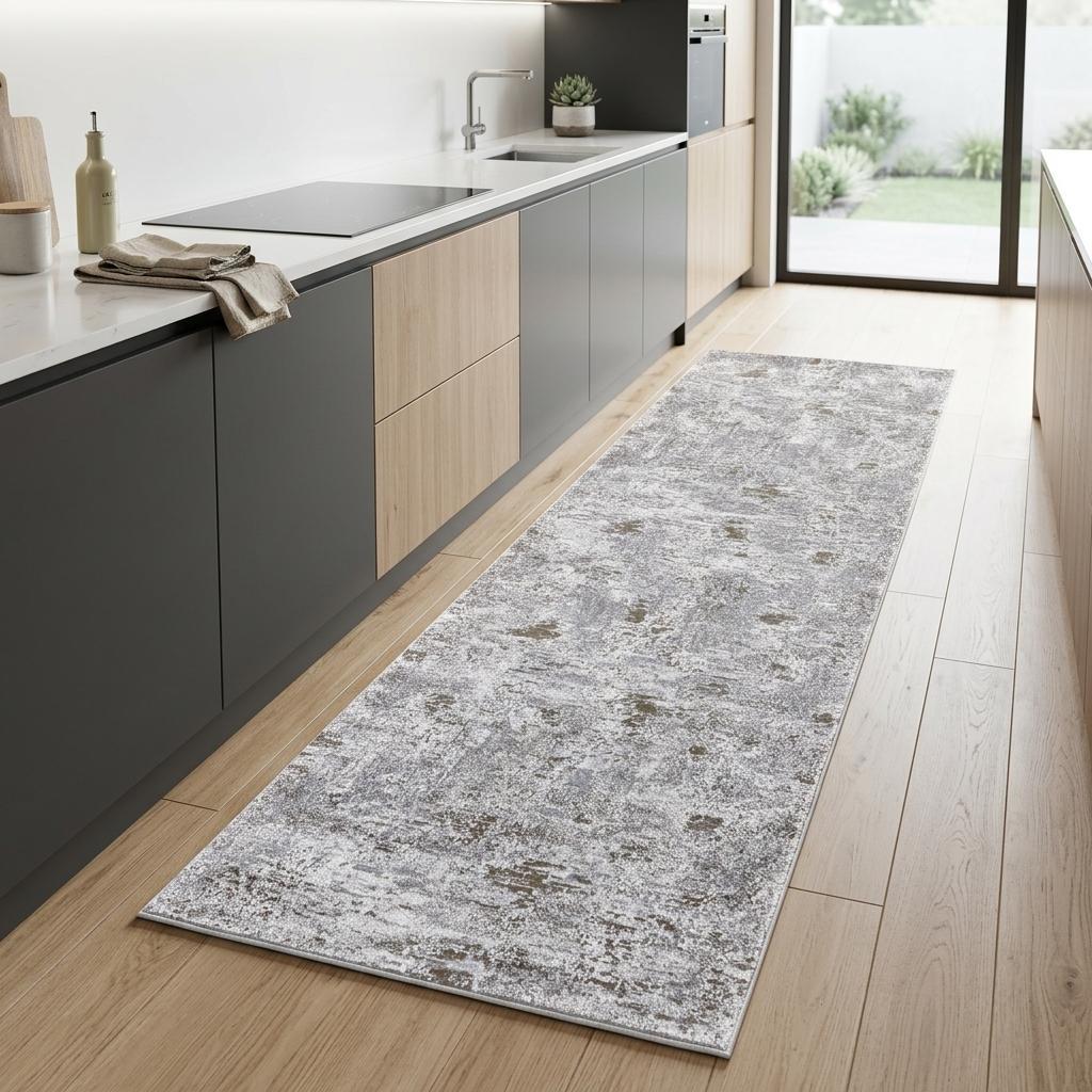 This 8-foot gray ivory and tan abstract distressed runner rug, is a great way to add warmth to a room. Ideal for spaces with kids and pets, this rug is stain resistant to help repel dirt and spilled liquids. Built to last, this rug crafted from polypropylene and polyester fibers is known for its durability and long lasting appeal. This contemporary style runner makes a great accent for the hallway, in front of cabinets, in the laundry room, or any other space you need a narrow and long rug. 34.00-inch h x 94.00-inch w x 0.63-inch d.