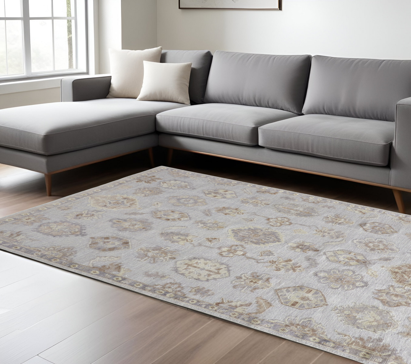 Set an inviting tone in your space with this 8' x 10' ivory silver and tan floral hand knotted stain resistant area rug. This rectangle shaped rug features a floral design in ivory silver and tan to give it visual interest. A classic shape marries with good looking design for your space Ideal for spaces with kids and pets, this rug is stain resistant to help repel stains and spilled liquids. Crafted by skilled artisans, this hand knotted rug is genuine and unique. No two will be exactly alike. Area Rugs help to give warmth and sense of home to your space. 0.35" H x 96" W x 120" D