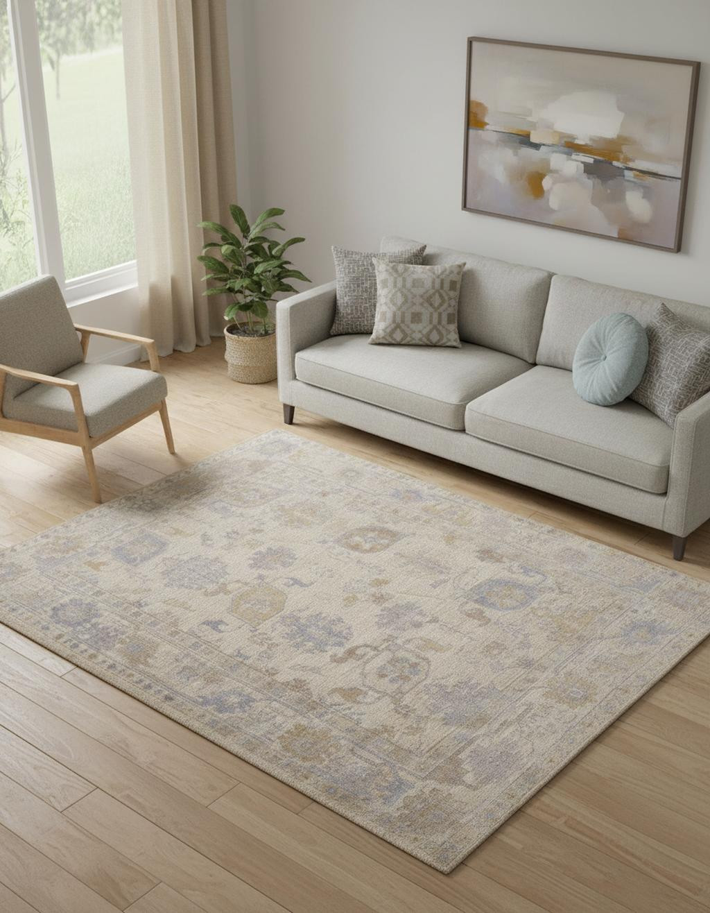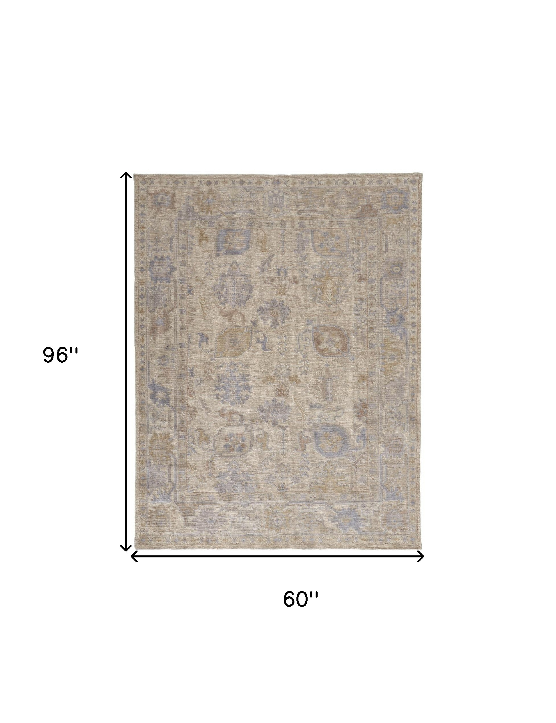 Set an inviting tone in your space with this 5' x 8' tan orange and blue floral hand knotted stain resistant area rug. This rectangle shaped rug features a floral design in tan orange and blue to give it visual interest. A classic shape marries with good looking design for your space Ideal for spaces with kids and pets, this rug is stain resistant to help repel stains and spilled liquids. Crafted by skilled artisans, this hand knotted rug is genuine and unique. No two will be exactly alike. Place this area rug against a hardwood or tile floor and it will enliven your living space with style and sophistication. 0.35" H x 60" W x 96" D