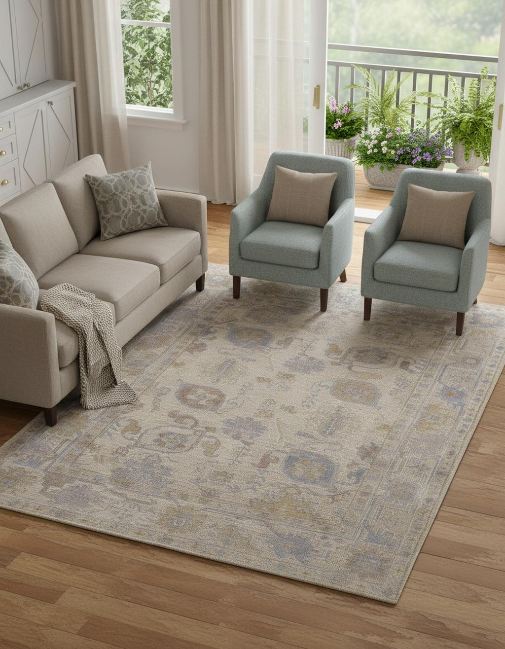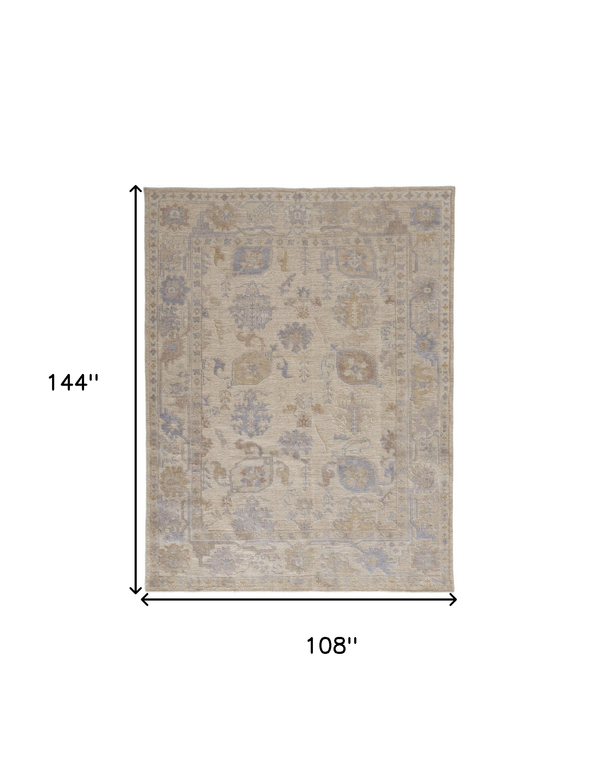 This 9' x 12' tan orange and blue floral hand knotted stain resistant area rug, is a great way to add warmth to a room. This rectangle shaped rug features a floral design in tan orange and blue to give it visual interest. A classic shape marries with good looking design for your space Ideal for spaces with kids and pets, this rug is stain resistant to help repel stains and spilled liquids. Crafted by skilled artisans, this hand knotted rug is genuine and unique. No two will be exactly alike. Place this area rug against a hardwood or tile floor and it will enliven your living space with style and sophistication. 0.35" H x 108" W x 144" D