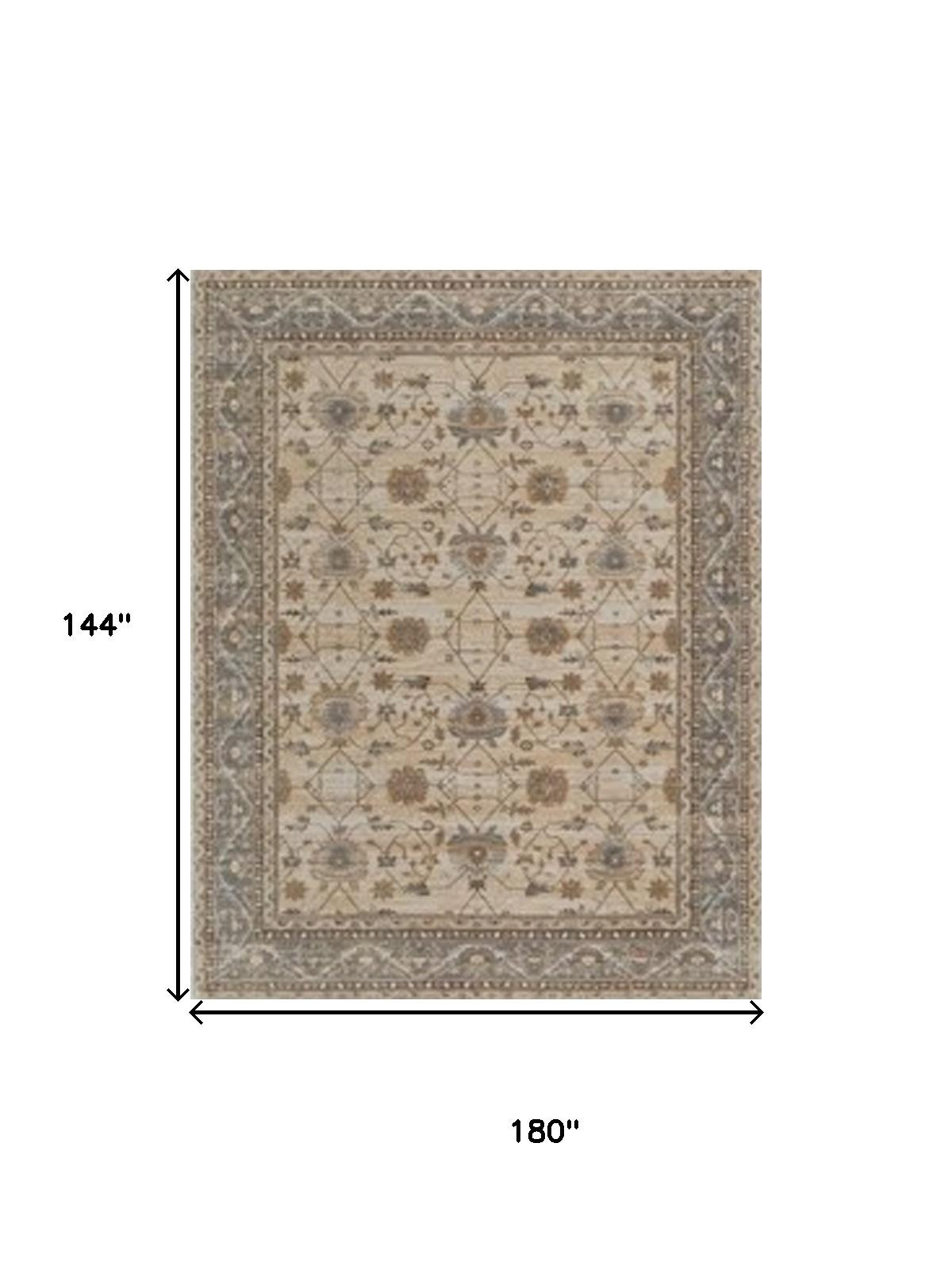 Set an inviting tone in your space with this 12-foot x 15-foot tan ivory and gray oriental area rug. Rugs are a great way to showcase your style, hide imperfections, warm your home and reduce noise. Crafted with a high-quality viscose material, this rug delivers both durability and elegance. The machine-made construction ensures it withstands daily use while maintaining its vibrant colors. With a power loom technique, the intricate patterns are perfectly defined. A latex backing provides stability, making it ideal for high-traffic areas. A rug pad is recommended for added comfort and longevity. 144.00-inch h x 180.00-inch w x 0.39-inch d.