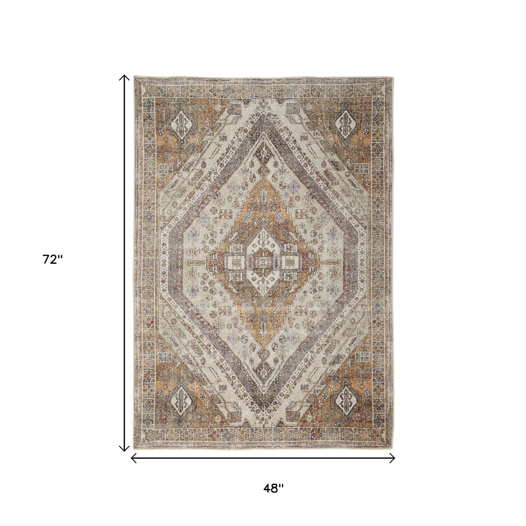 This 4-foot x 6-foot brown ivory and orange medallion area rug, is a great way to add warmth to a room. Built to last, this rug crafted from polyester fibers is known for its durability and long lasting appeal. Rugs are a great way to showcase your style, hide imperfections, warm your home and reduce noise. 48.00-inch h x 72.00-inch w x 0.08-inch d.