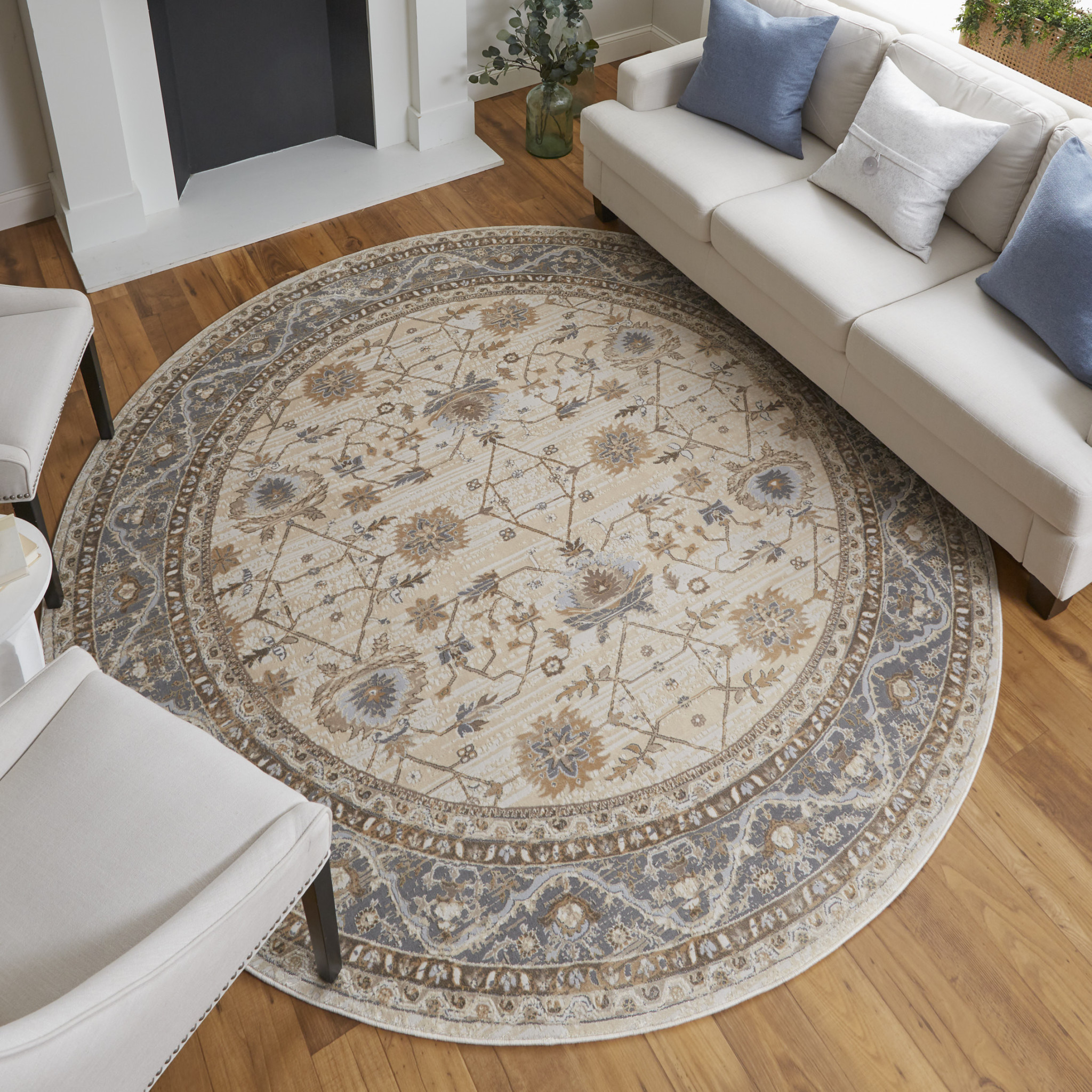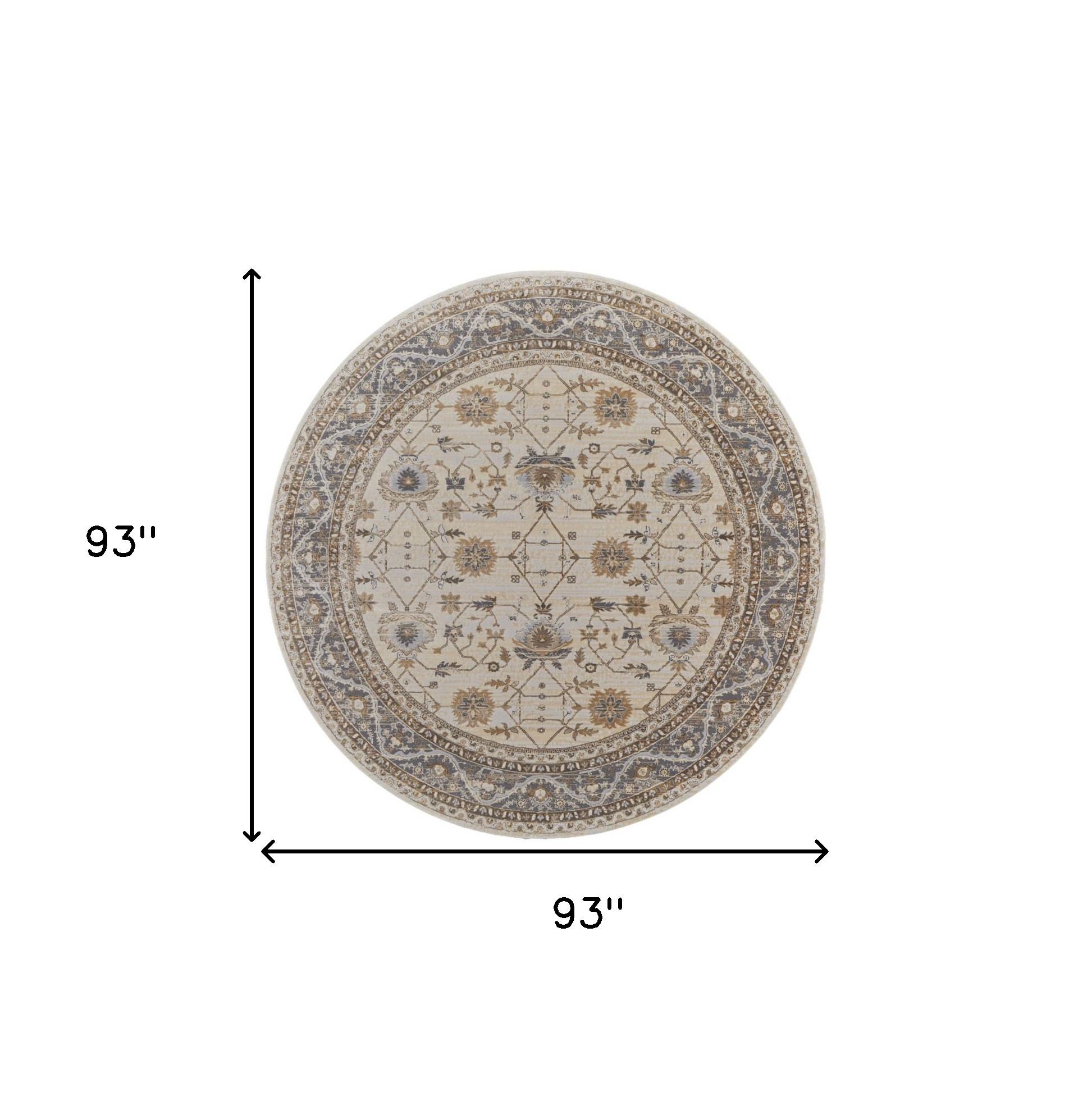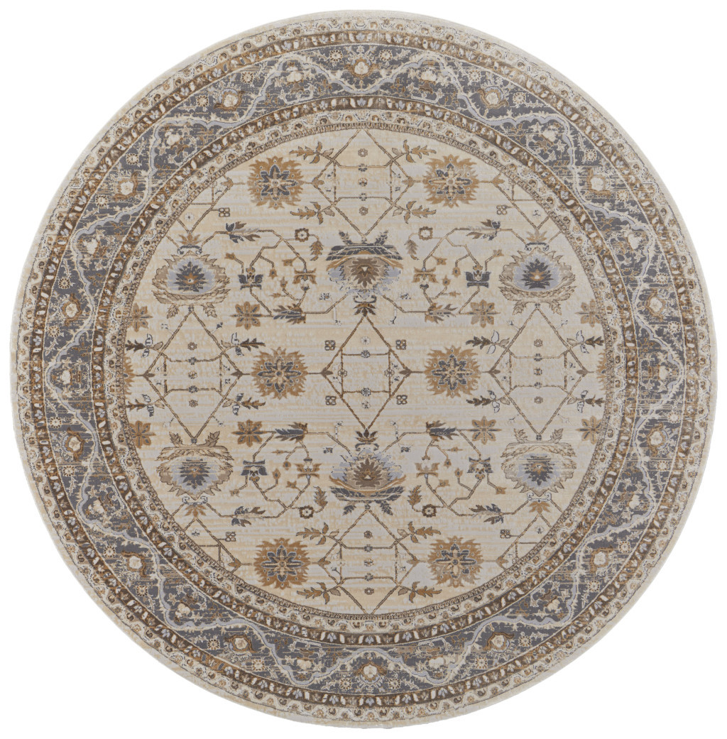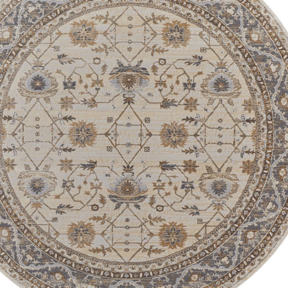 Add great coloration and comfortable texture to your space with this 8-foot tan ivory and gray oriental distressed round rug. Built to last, this rug crafted from viscose and polyester fibers is known for its durability and long lasting appeal. Rugs are a great way to showcase your style, hide imperfections, warm your home and reduce noise. This larger sized, transitional styled rug is ready to create a focal point or statement piece in your room. 93.00-inch h x 93.00-inch w x 0.39-inch d.