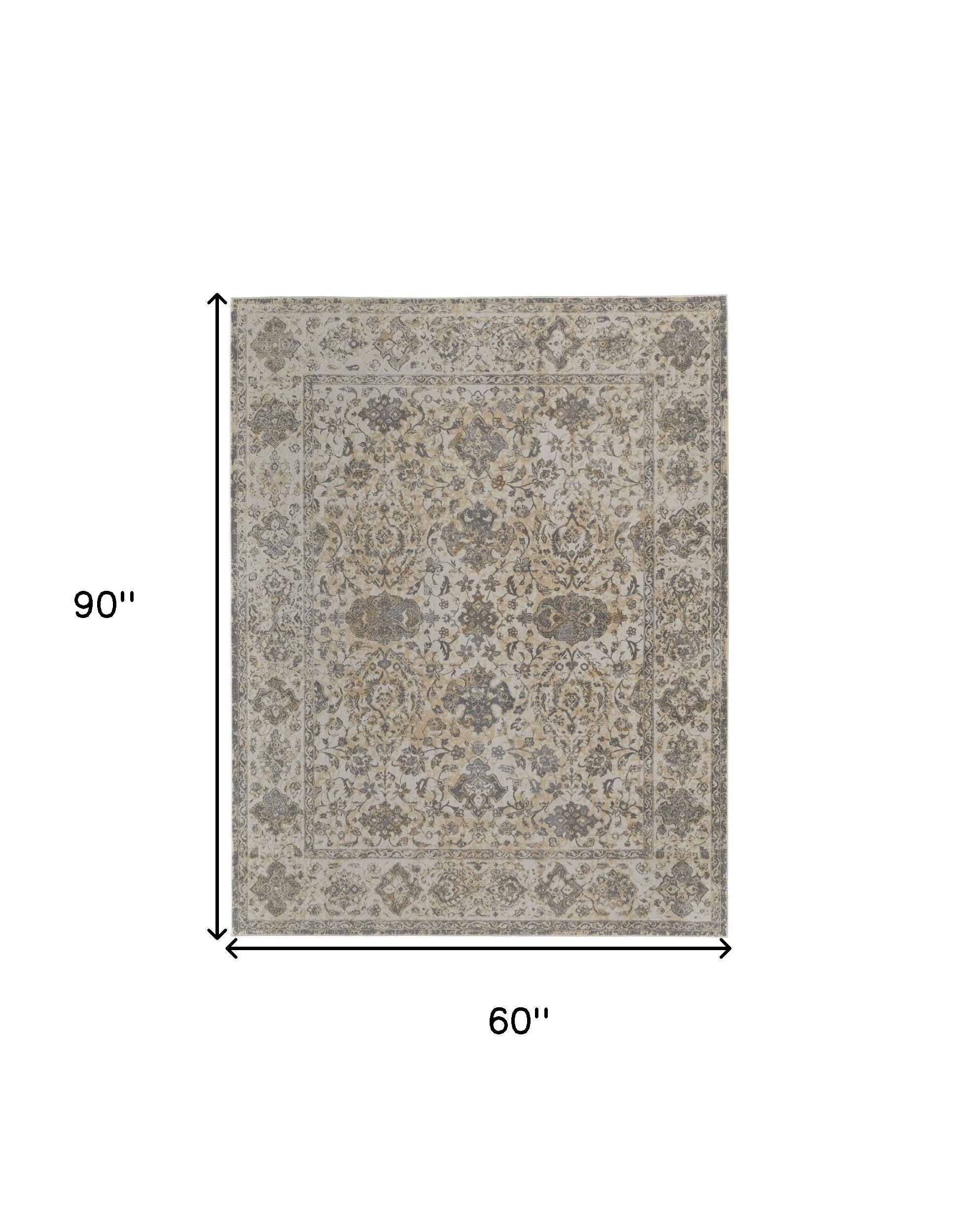 This 5-foot x 8-foot gray ivory and tan oriental area rug, is a great way to add warmth to a room. Made from luxurious viscose, this rug boasts a soft texture that enhances comfort underfoot. Its machine-made construction ensures durability while the power loom technique provides intricate design details. With a recommended rug pad, this rectangular rug stays in place, offering both safety and style. The latex backing adds an extra layer of support for long-lasting use, making it a perfect addition to any living space. 60.00-inch h x 90.00-inch w x 0.39-inch d.