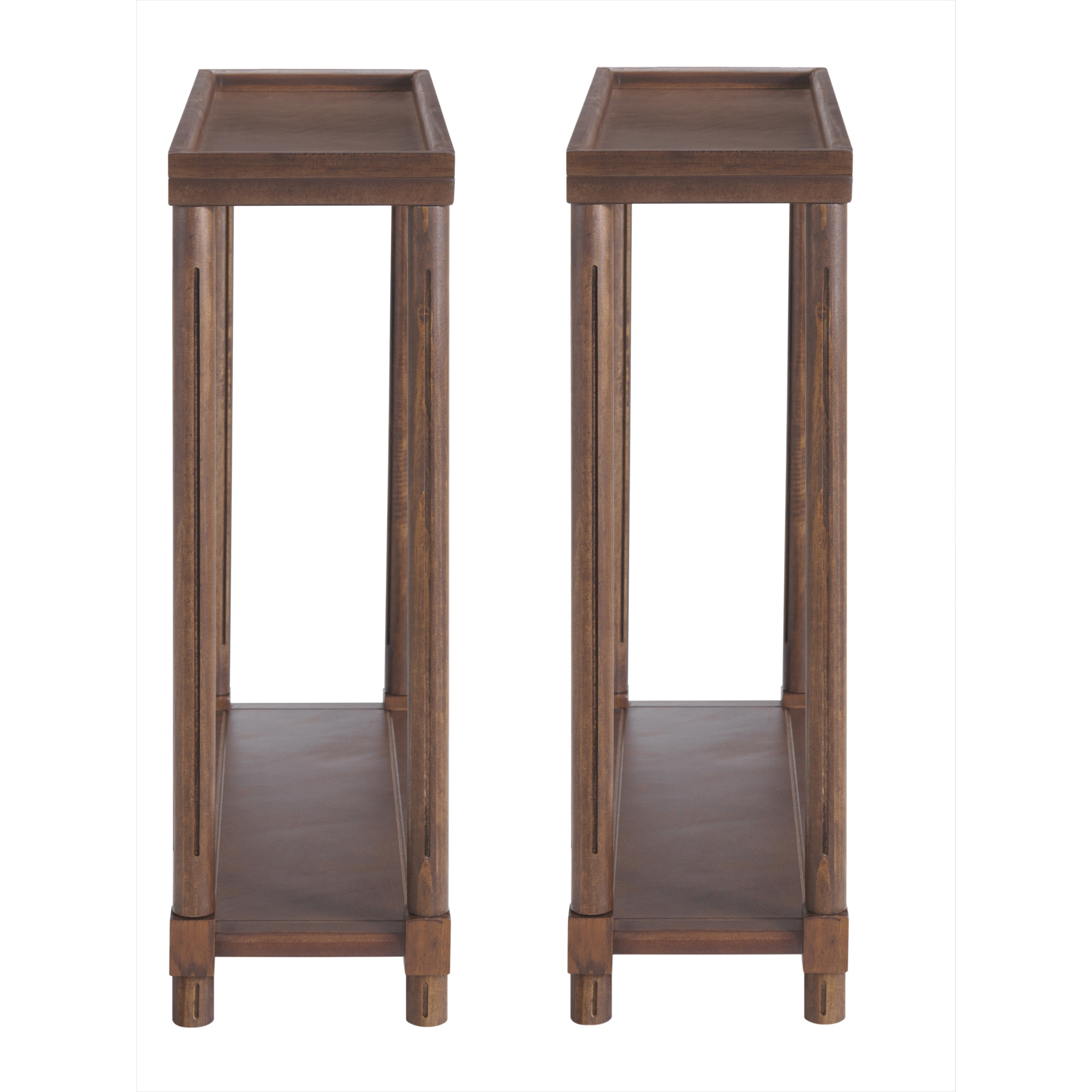 Increase your decorating options with this set of two 24-inch brown wood rectangular end tables with shelf that will enhance your space. This pair makes the ideal companion for flanking the sofa or bed and can be used together or separately as you choose. The purposefully distressed finish gives these solid wood tables an authentically rustic feel. Includes a single shelf for handy storage or display space. This versatile table set is a great accent for most any room. 24-inch H x 22-inch W x 8-inch D