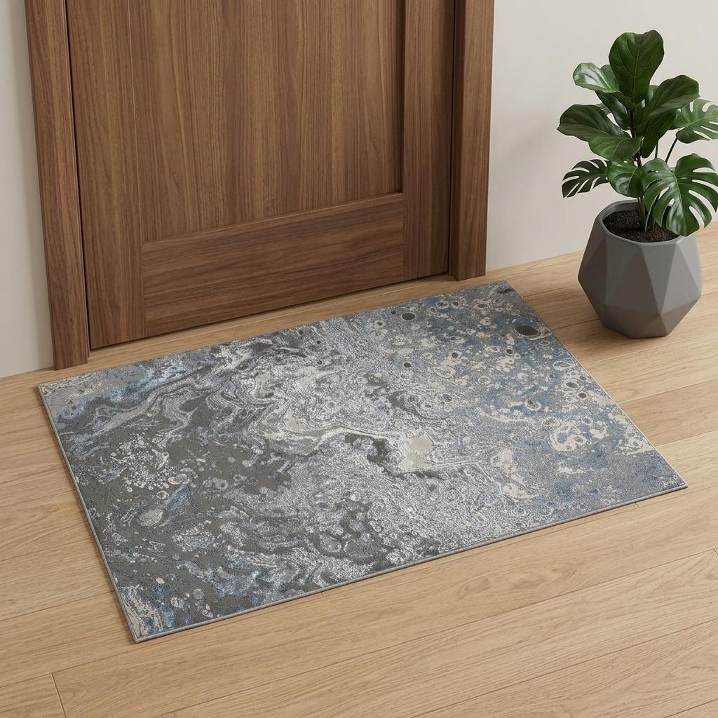 Add some artistry to your room with this 2-foot x 3-foot blue and gray abstract power loom area rug. This rectangle shaped rug features a abstract design in blue and gray to give it visual interest. A classic shape marries with good looking design for your space ideal for spaces with kids and pets, this rug is stain resistant to help repel stains and spilled liquids. Place this area rug against a hardwood or tile floor and it will enliven your living space with style and sophistication. 20-inch H x 34-inch W x 0.39-inch D