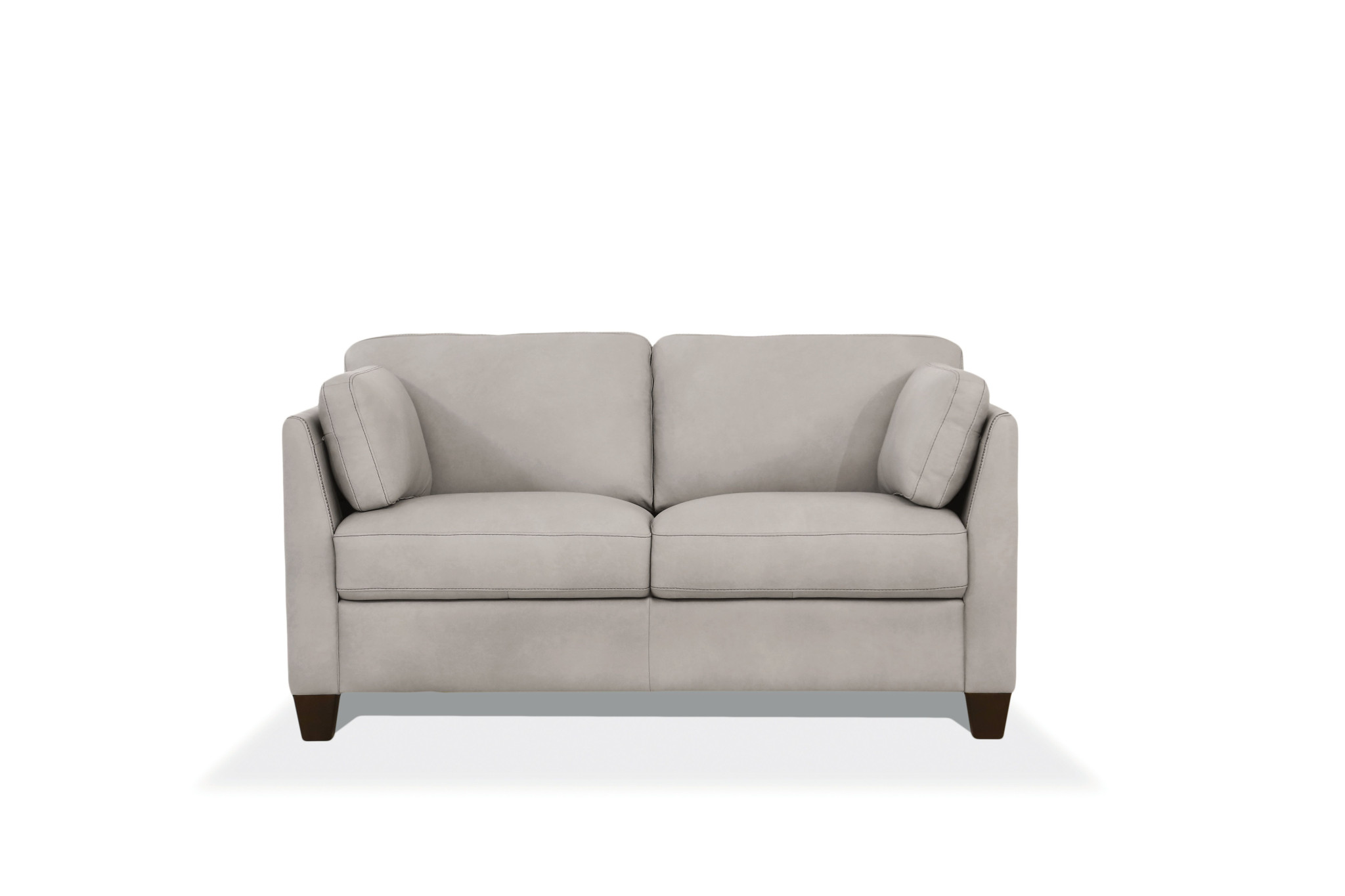 An interior designer's dream, this buttery soft high grade leather 59-inch dusty white and brown leather loveseat will bring just the right touch to your space. The high grade premium leather used makes your lounging luxuriously comfortable and adds an elegant appeal to your space. Square arms offer a comfy place to rest and give this piece some interest and shape. A great showpiece for your room, this sofa is a must have. 31-inch H x 59-inch W x 34-inch D