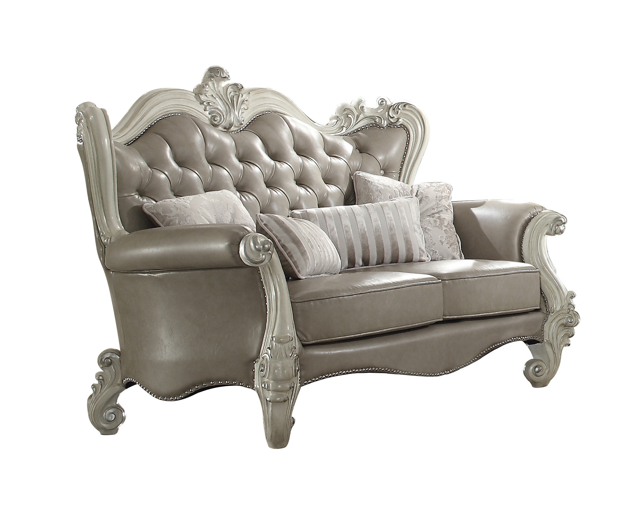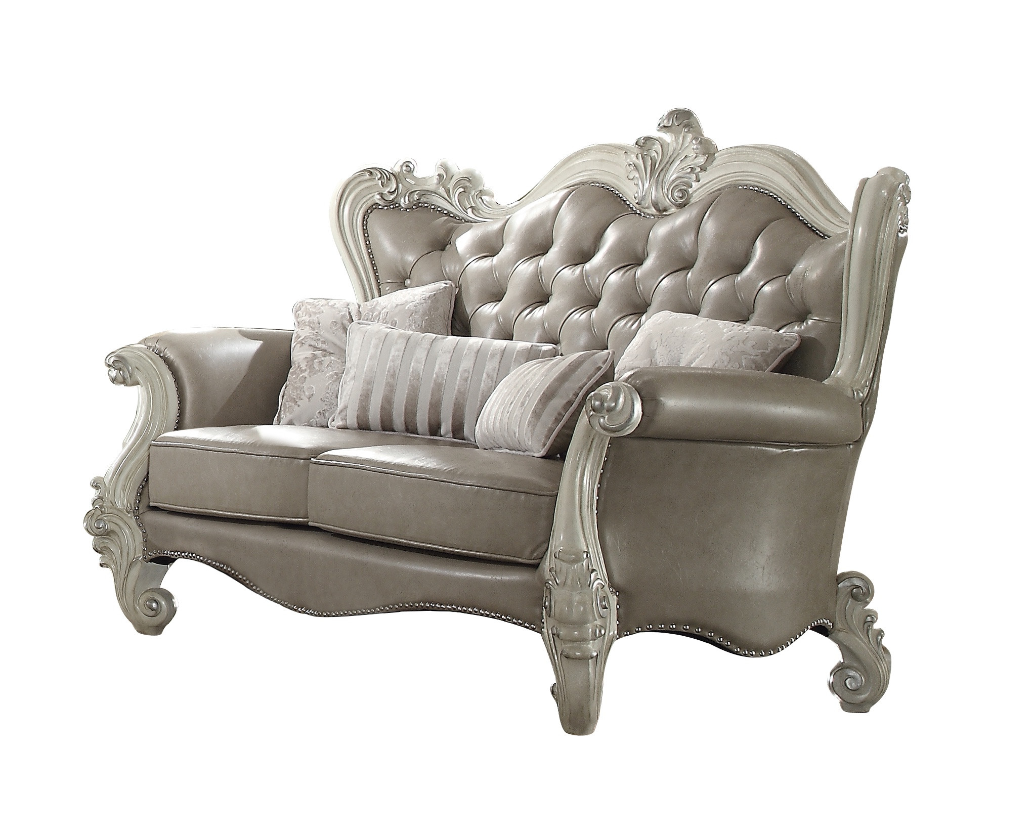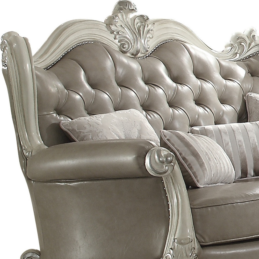 With a look and feel like leather, this 68-inch vintage gray faux leather and bone white love seat is made from sturdy and resilient polyurethane to stand up to the test of time. Square_arms offer a comfy place to rest and give this piece some interest and shape. A great showpiece for your room, this sofa is a must have. 50-inch h x 68-inch w x 44-inch d.