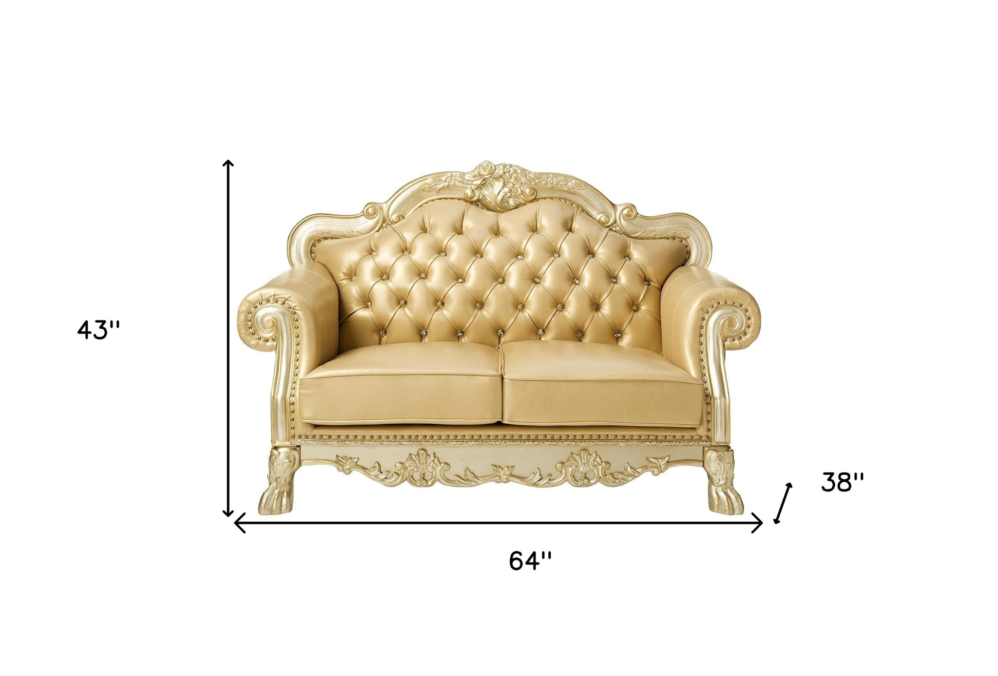 This 64-inch bone and gold faux leather loveseat and toss pillows is upholstered in sturdy and resilient polyurethane that will look and feel like leather. This highly detailed and ornately carved loveseat features button tufted cushions and nailhead trim. Rolled arms offer a comfy place to rest and give this piece some interest and shape. A great showpiece for your room, this sofa is a must have. 43-inch H x 64-inch W x 38-inch D
