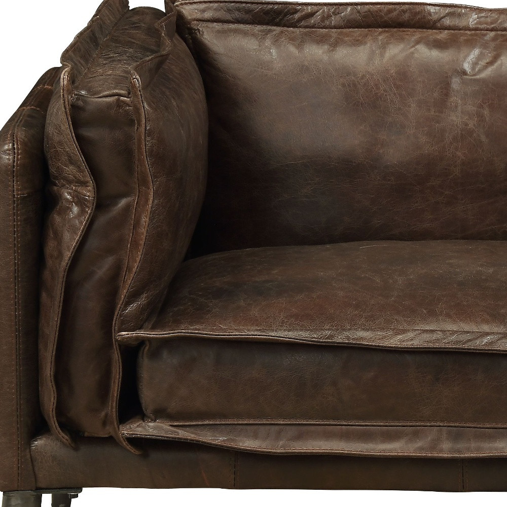 A mix of form and function, this 47-inch brown and black top grain leather chair and a half will bring a good looking and usable accent to your space. This gorgeous solid color brown chair and a half is masterfully upholstered in durable top grain leather. The sturdy inner frame is built with high quality manufactured wood, includes armrests, and features a fixed back that is accented with soft and comfortable cushioning. 30-inch h x 47-inch w x 34-inch d.