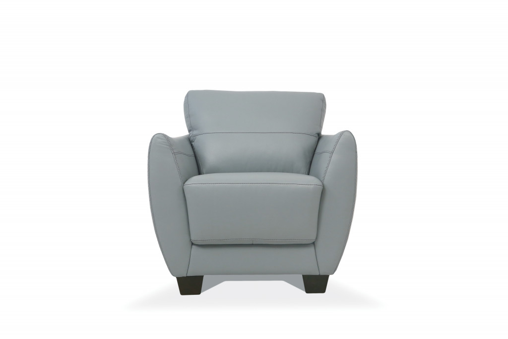 Unique and decorative, this 33-inch gray and black genuine leather arm chair will leave a lasting impression. This gorgeous solid color gray arm chair is masterfully upholstered in durable genuine leather. Giving the chair stability and structure, the inner frame is constructed with high quality manufactured wood, includes comfy armrests, and features a fixed back that comes complete with soft and comfortable cushioning. 31-inch h x 33-inch w x 36-inch d.