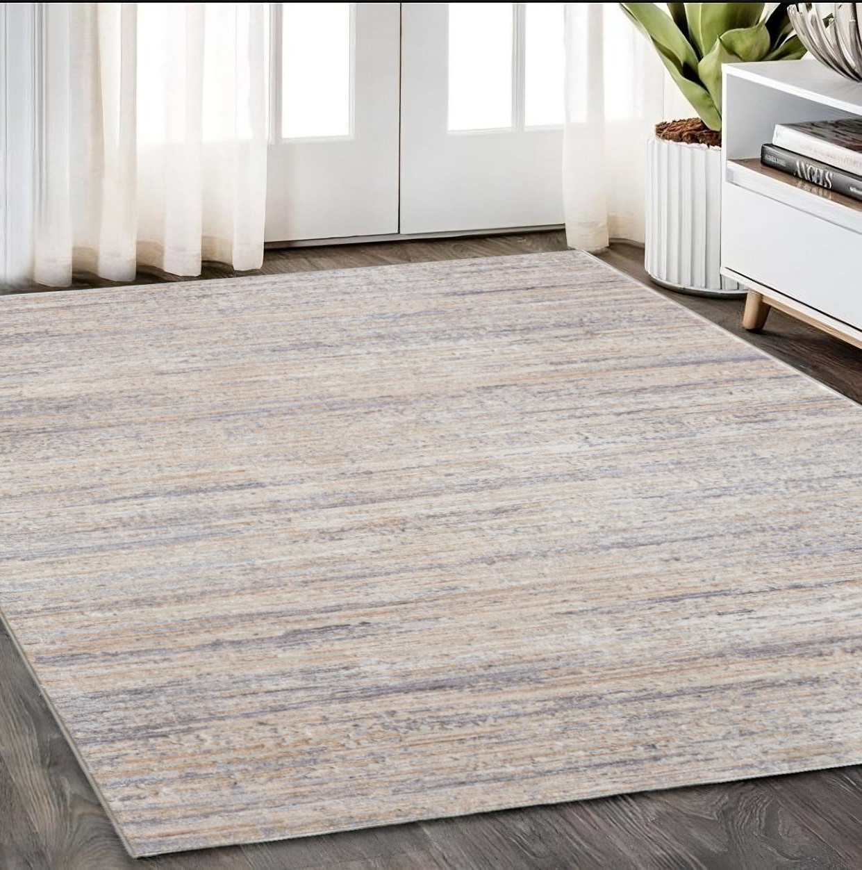 Add some artistry to your room with this 5-foot x 8-foot beige and gray striped area rug. Ideal for spaces with kids and pets, this rug is stain resistant to help repel dirt and spilled liquids. Built to last, this rug crafted from polyester fibers is known for its durability and long lasting appeal. Rugs are a great way to showcase your style, hide imperfections, warm your home and reduce noise. This larger sized, contemporary styled rug is ready to create a focal point or statement piece in your room. 60-inch h x 95-inch w x 0.4-inch d.