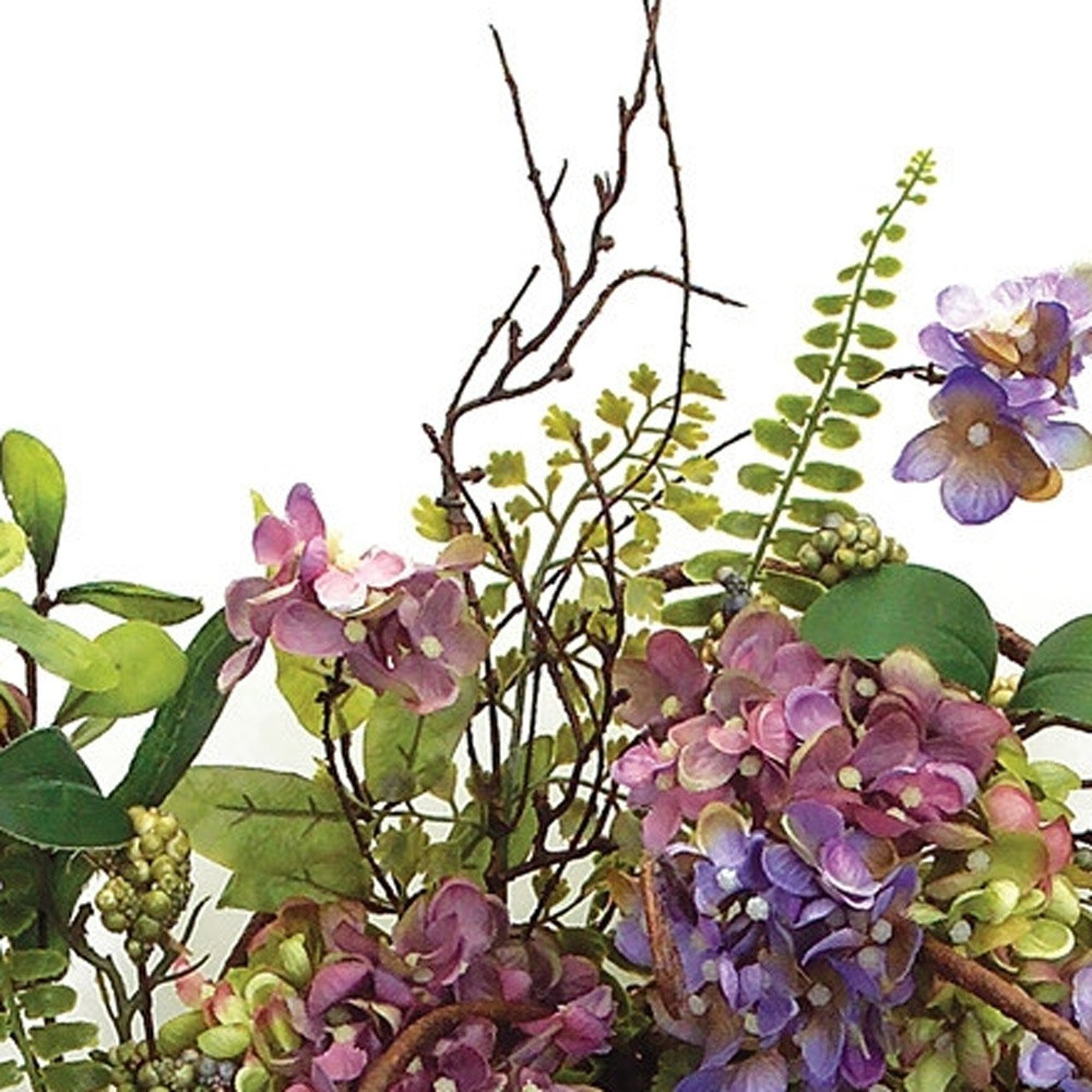 This artificial wreath will hold its color for years to come. This lovely wreath makes a wonderful gift and is sure to brighten someone's day. The wreath is made of high-quality polyester material and features beautiful artificial hydrangeas in a vibrant purple color. Its circular shape adds a traditional touch to any space. Perfect for covered outdoor use, this unlit wreath can be displayed on your front door or in your living room to create a welcoming atmosphere. Ideal for the summer season, the wreath has a hole diameter of 5.5 inches, making it easy to hang and enjoy its timeless beauty. 22-inch H x 22-inch W x 5-inch D