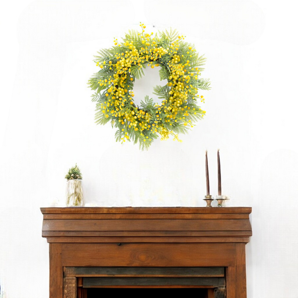 This artificial wreath is easy to maintain. Pack it away when you are not using it and you will find it equally fresh every time you unpack it. This lovely wreath makes a wonderful gift and is sure to brighten someone's day. Featuring a traditional circular design, it showcases beautiful green and yellow fern accents that bring a touch of nature indoors. Ideal for covered outdoor use, this wreath adds charm to your home decor while requiring minimal upkeep. Its durable polyurethane material ensures long-lasting beauty. 27-inch h x 27-inch w x 8-inch d.