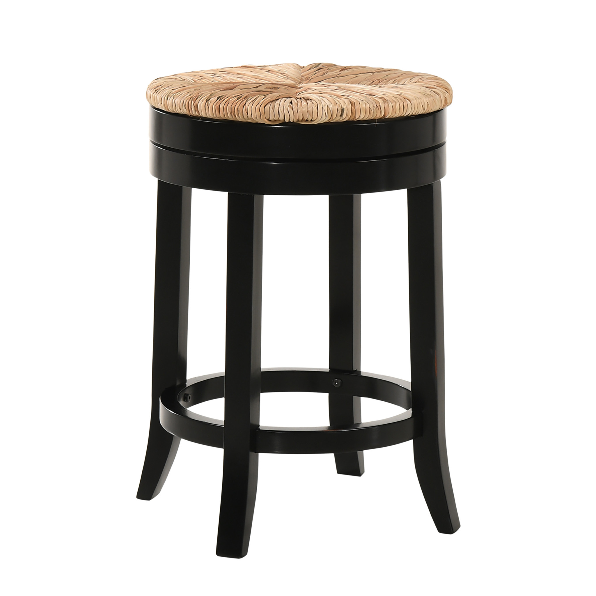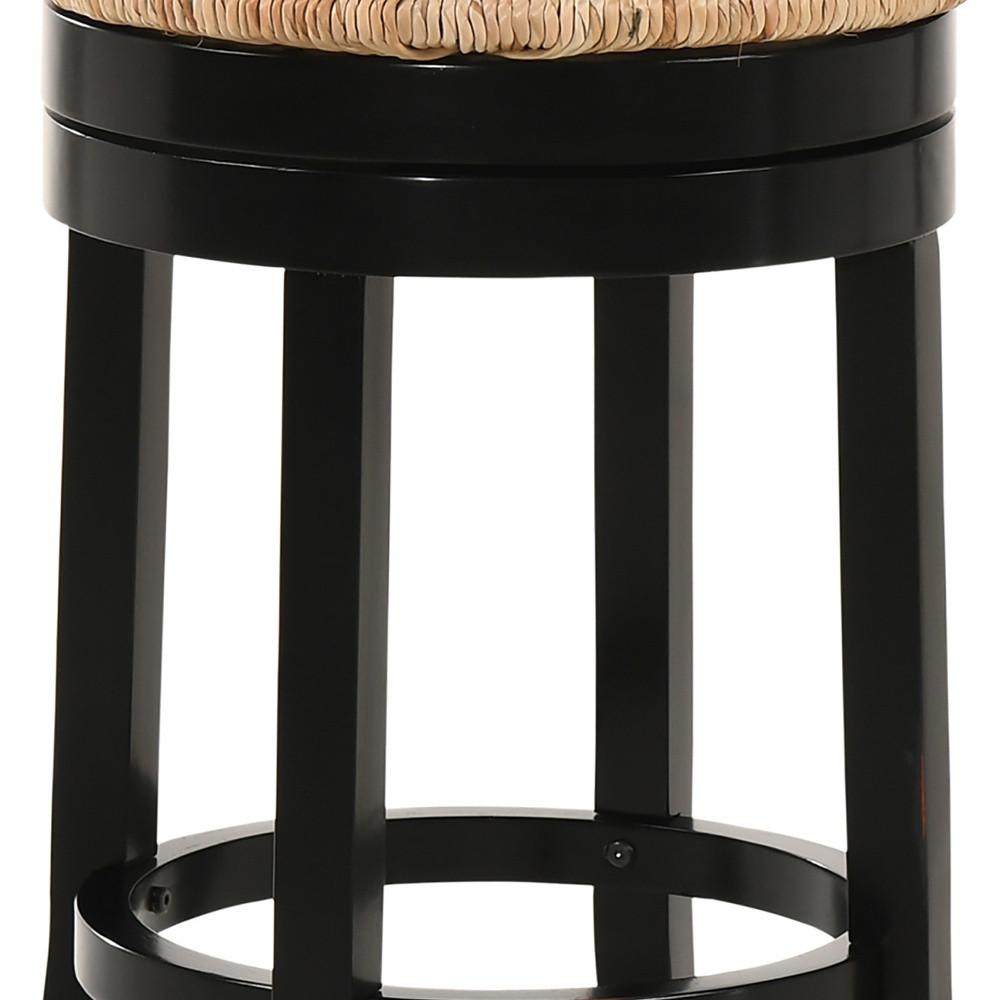 Comfortable enough to sit in for awhile, this 24-inch natural and black rush and solid wood backless counter height swivel bar chair will transcend the look of your room. Quality construction from black solid wood combines with natural rush to give this stool a fresh and updated look. Designed to be good looking and practical, this backless bar chair features a round shaped seat. Designed with a footrest for comfort and convenience. 24-inch h x 19.5-inch w x 19.5-inch d.