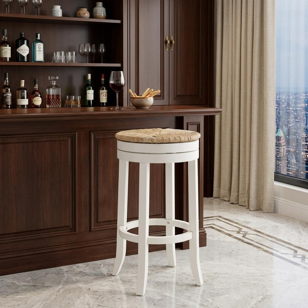This 30-inch natural and antiqued white solid wood swivel backless bar height bar chair with footrest will be the perfect way to add some cool design and utility to your space similar to what you find in your favorite cafes or pubs. The antiqued white coloration of the high quality solid wood base marries nicely with the natural rush seat. Designed to be good looking and practical, this backless bar chair features a round shaped seat. Designed with a footrest for comfort and convenience. 30-inch H x 19.5-inch W x 19.5-inch D