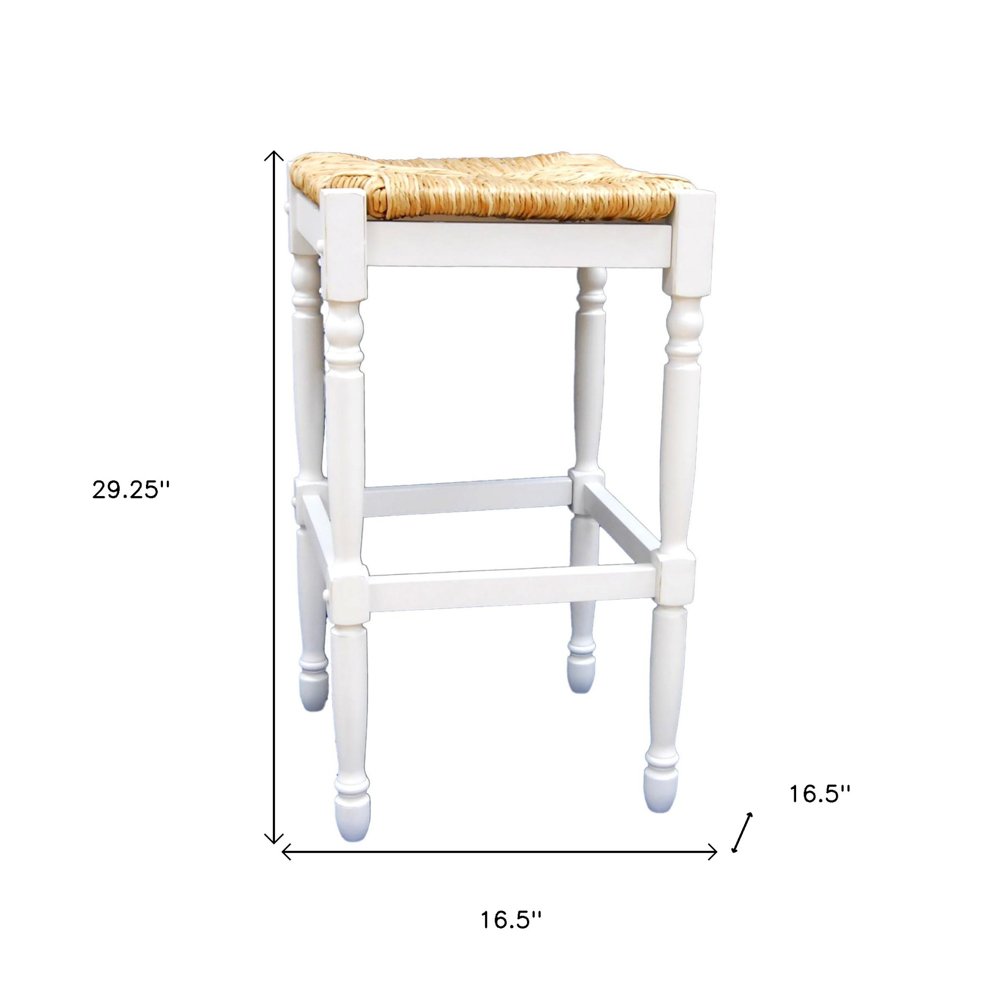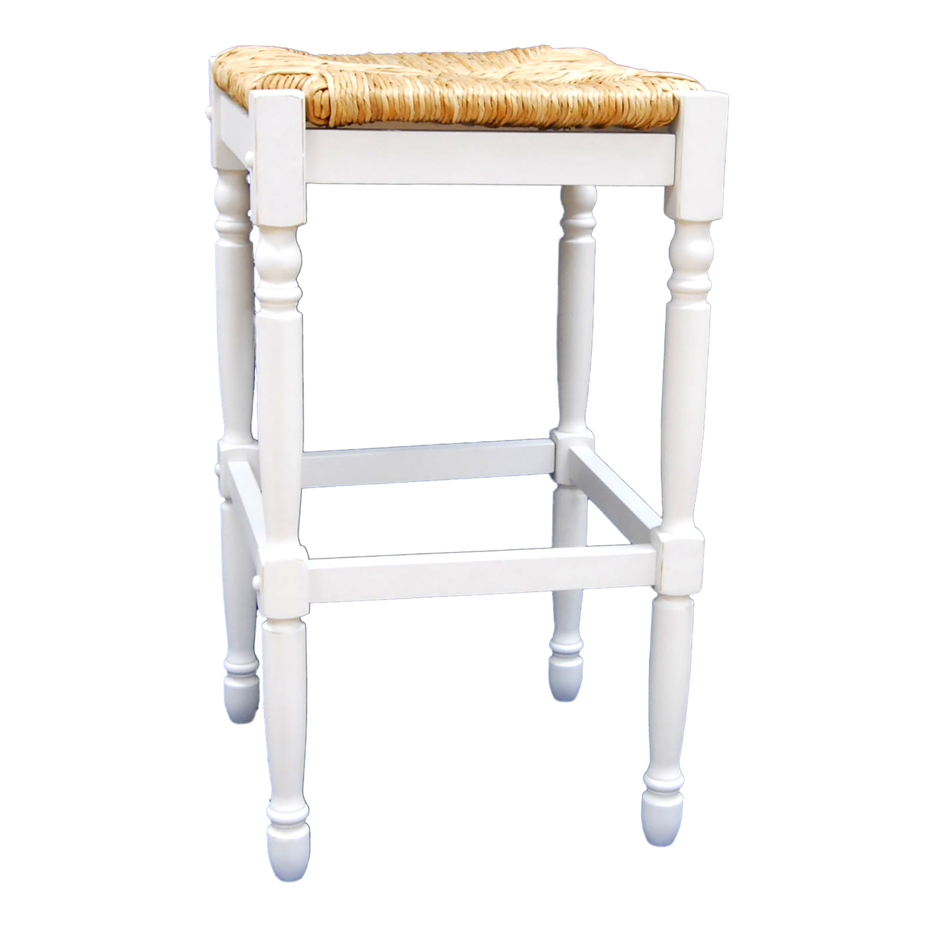 With this 29-inch natural and antiqued white solid wood backless bar height bar chair you can add design and extra seating to your space. The antiqued white coloration of the high quality solid wood base marries nicely with the natural rush seat. Designed to be good looking and practical, this backless bar chair features a square shaped seat. Designed with a footrest for comfort and convenience. 29.25-inch H x 16.5-inch W x 16.5-inch D