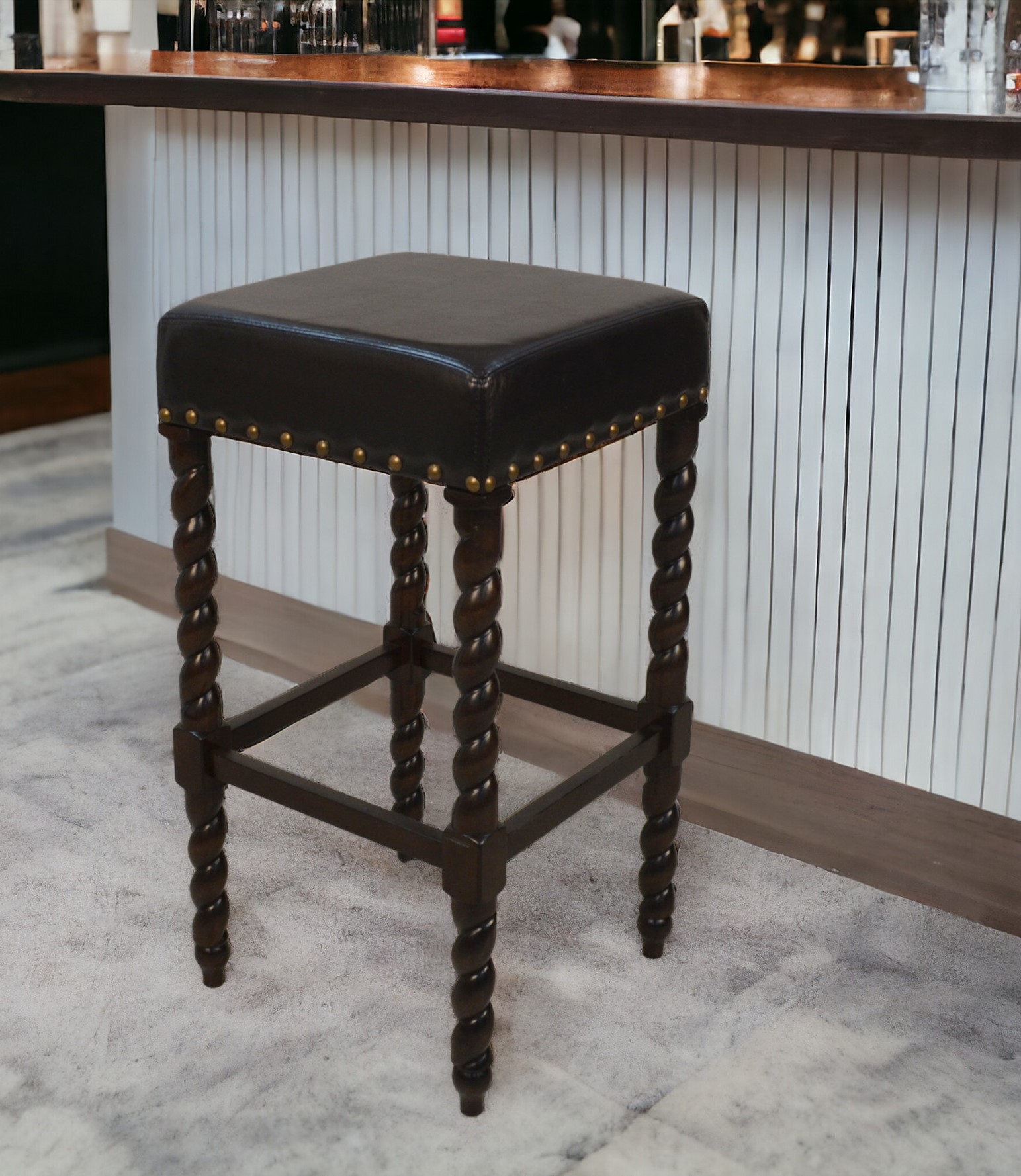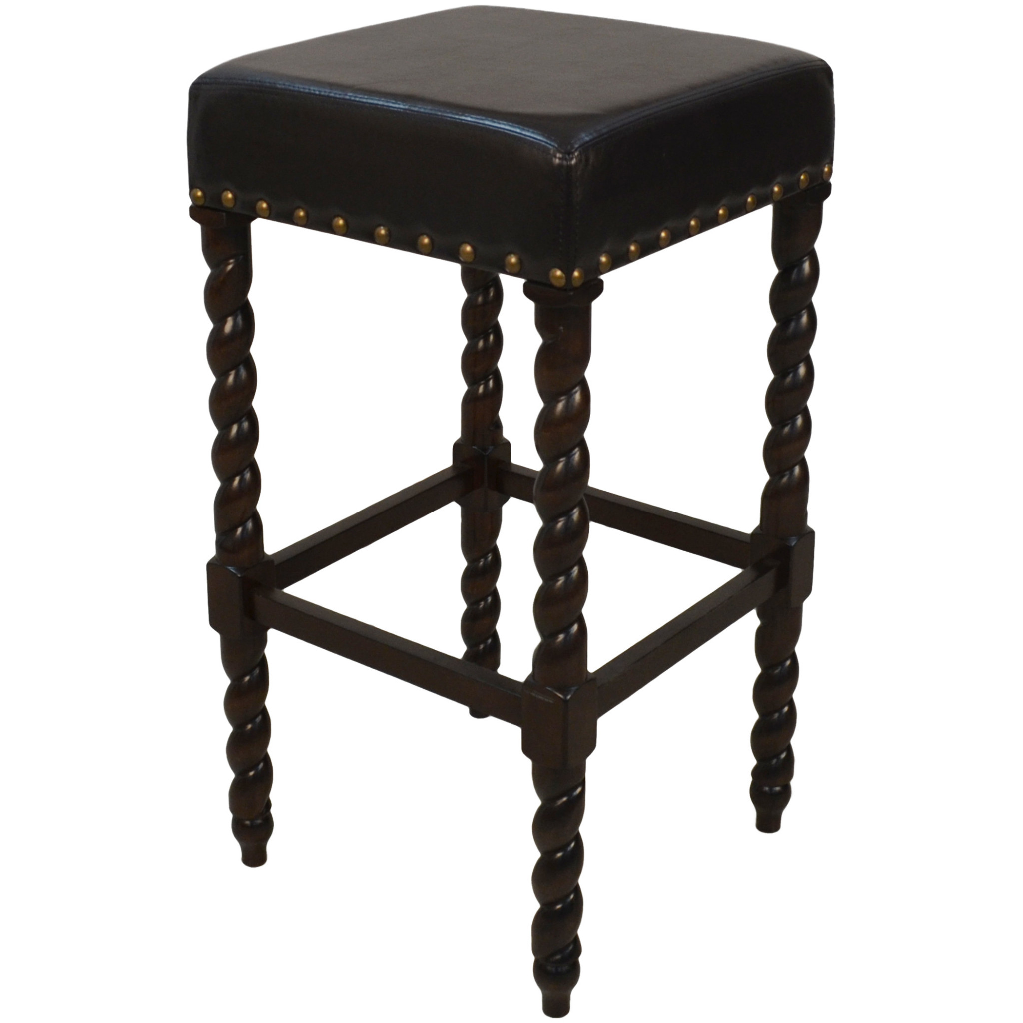 Comfort and design come together nicely in this 30-inch black and espresso faux leather and solid wood backless bar height bar chair. The base of this stool features twisted/turned legs made from solid wood in a dark espresso brown color that is a nice contrast to the black faux leather seat. Designed to be good looking and practical, this backless bar chair features a square shaped seat. Designed with a footrest for comfort and convenience. 30-inch H x 16.375-inch W x 16.375-inch D