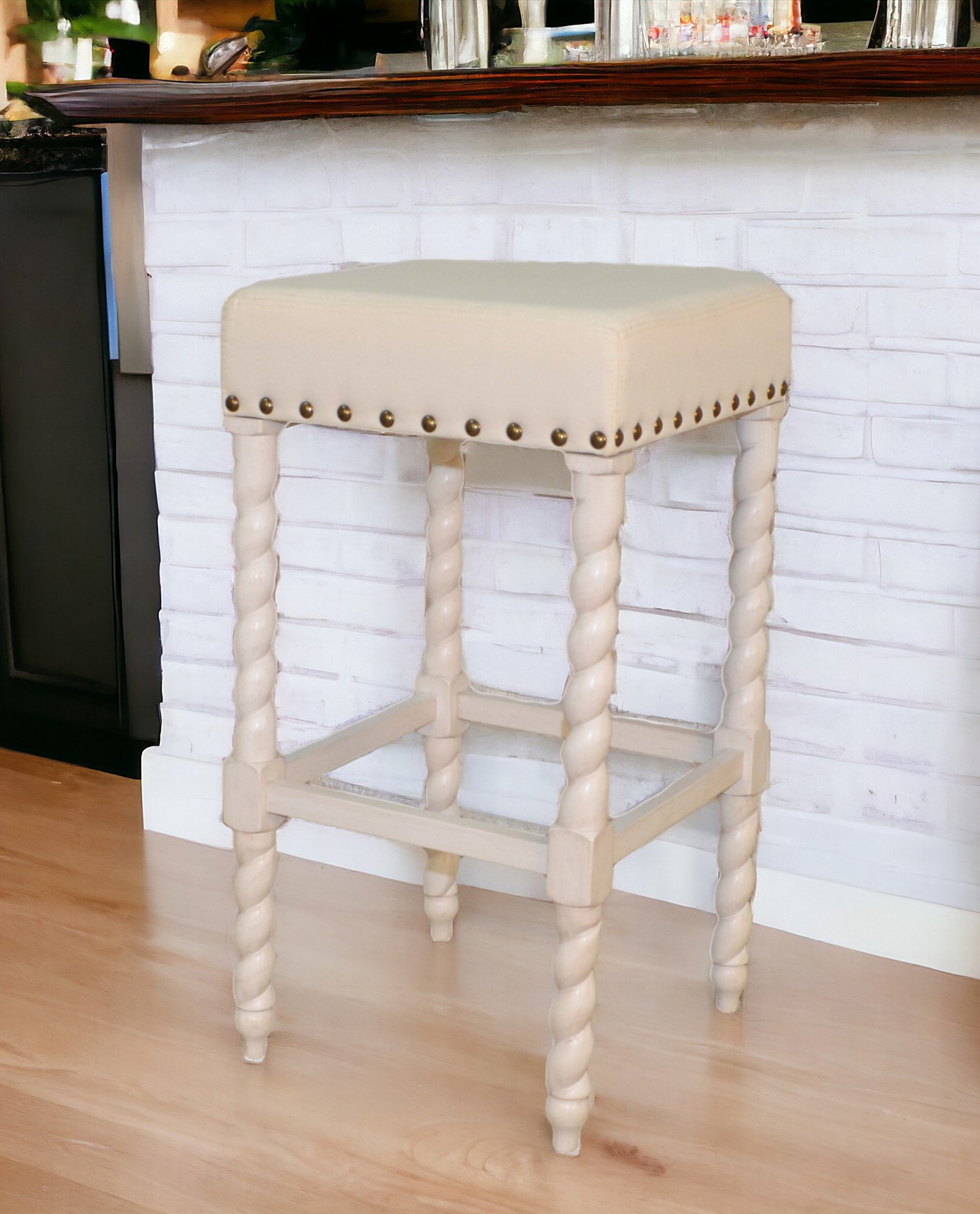 Bring a trendy bar vibe to your space, with this 30-inch cream and vanilla linen upholstered solid wood backless bar chair. The base of this stool is made from solid wood in an off-white vanilla color that coordinates with the cream linen fabric seat. The legs feature a turned and twisty design that give this stool some unique flair. The square shape of the seat give this backless chair a fresh and fashionable look. 30-inch H x 16.375-inch W x 16.375-inch D