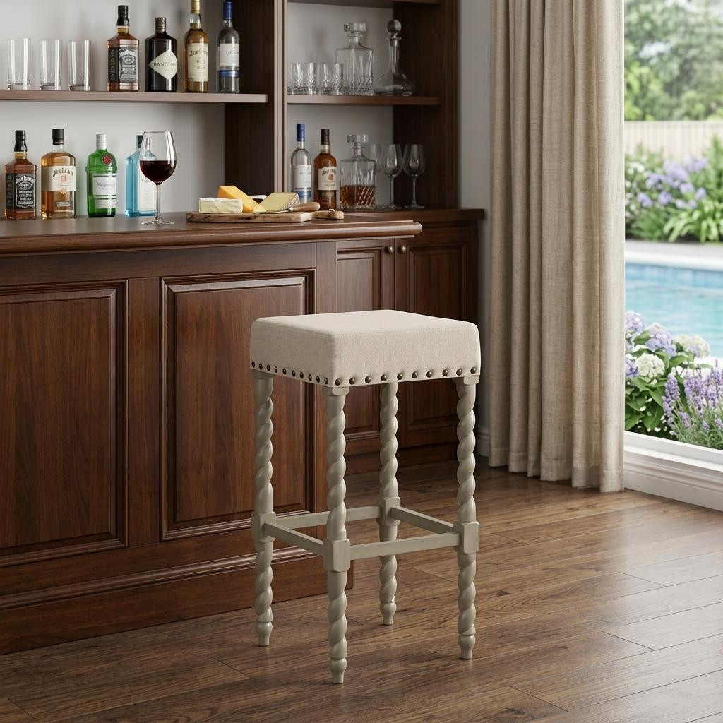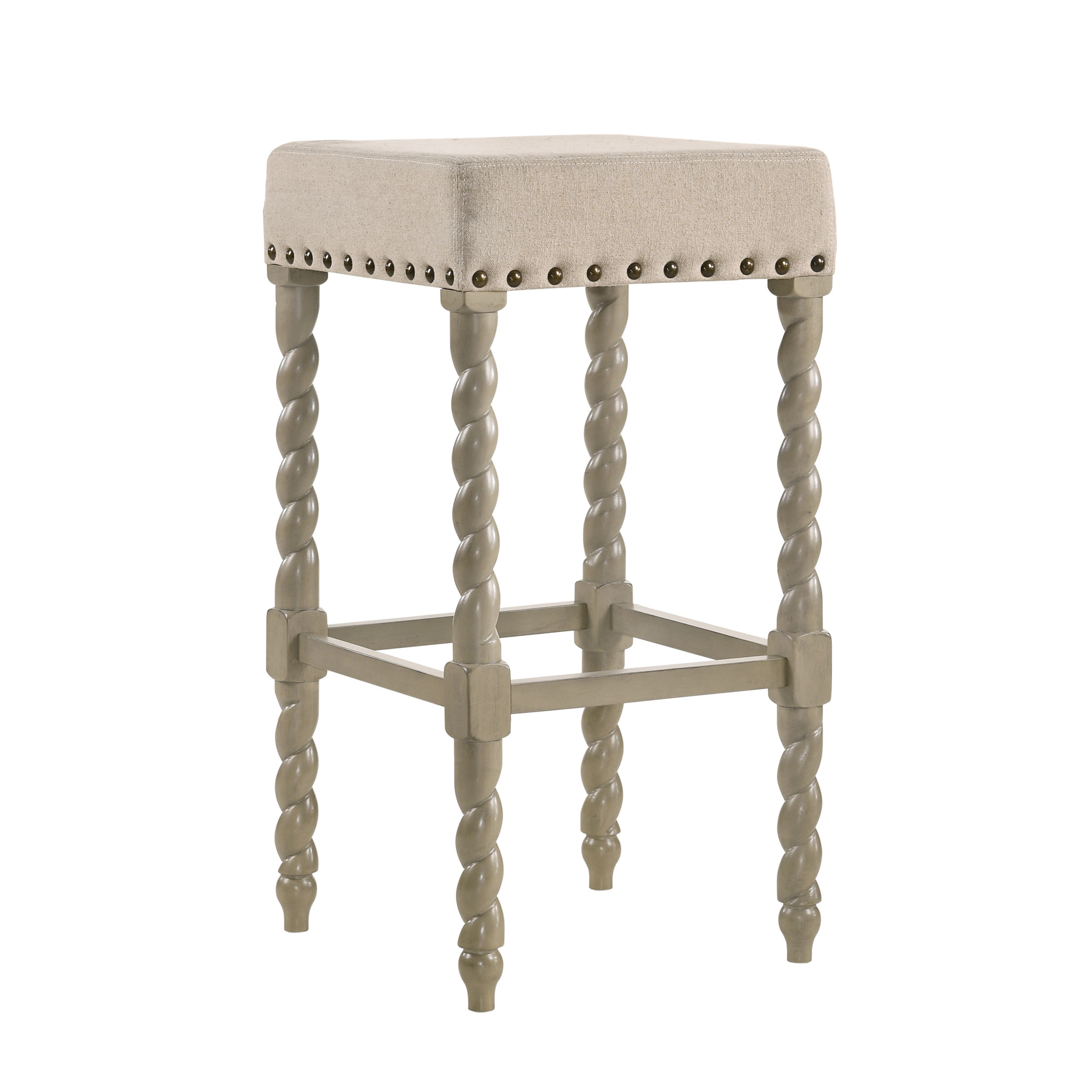 This 30-inch cream and gray solid wood backless bar height bar chair will be the perfect way to add some cool design and utility to your space similar to what you find in your favorite cafes or pubs. Quality construction from gray solid wood combines with cream fabric to give this stool a fresh and updated look. Designed to be good looking and practical, this backless bar chair features a square shaped seat. Designed with a footrest for comfort and convenience. 30-inch H x 16.375-inch W x 16.375-inch D