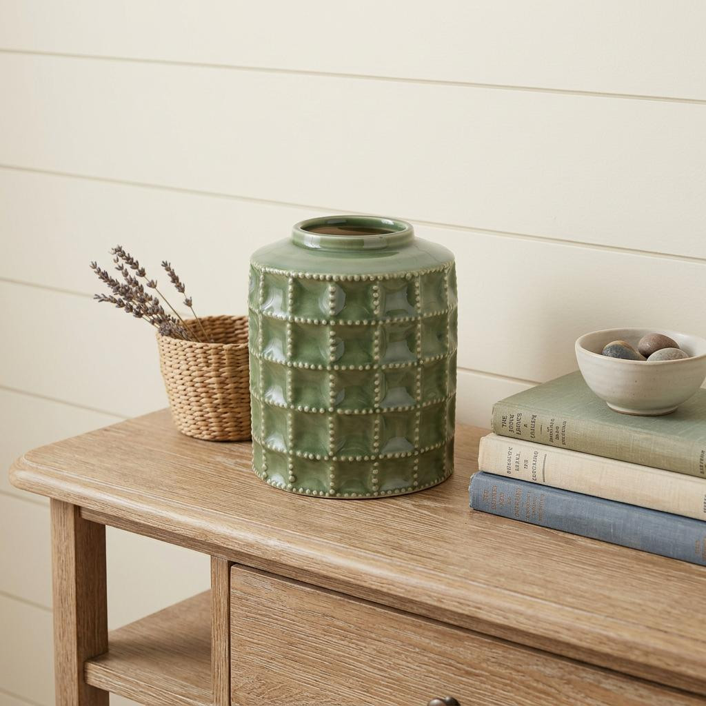 Elevate your living space with the 7-inch green terracotta geometric cylinder table vase. Crafted from high-quality terracotta, this table vase features a cylinder shape that adds a touch of modern elegance to any room. The deep green glazed ceramic glaze brings a refreshing pop of color to your decor, while the geometric design adds a unique and stylish touch. Perfect for displaying your favorite blooms or simply as a standalone decorative piece. 6.75-inch H x 5.5-inch W x 5.5-inch D