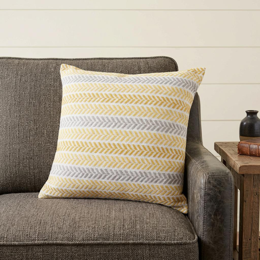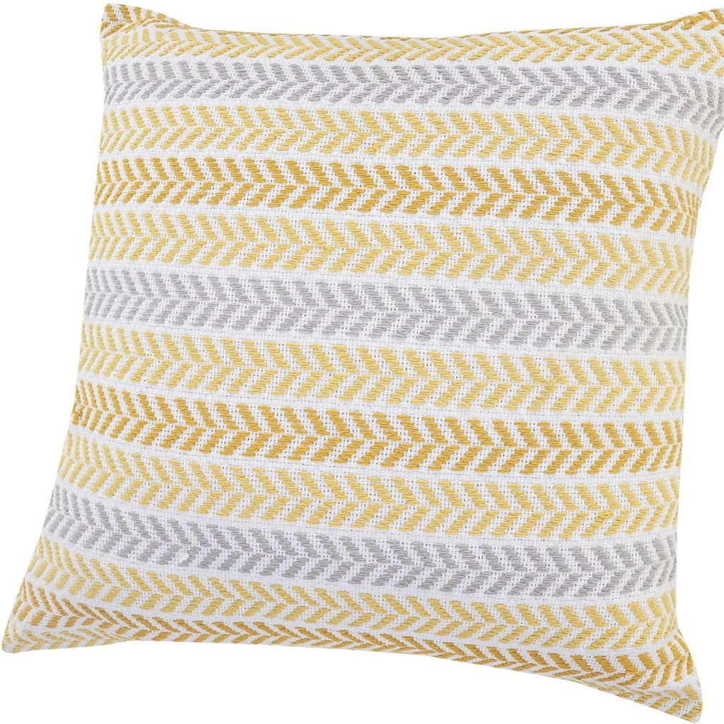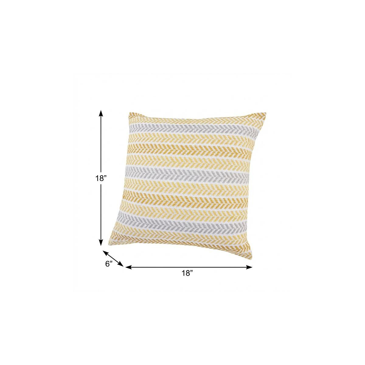 Add an air of fashion to your room and rejuvenate the space with this cute and fashionable 18-inch yellow and white throw pillow. Durable yellow and white cotton has been used to give this pillow a beautiful look that will stand the test of time. This soft polyfill filled pillow not only is decorative but made to be comfy and cozy all day long. Decorative pillows are a great way to change up the look and feel of your space easily and quickly. Decorative throw pillows not only add color and dimension to your space but can be comfy and supportive when you are lounging and cuddling as well. 18-inch h x 18-inch w x 6-inch d.