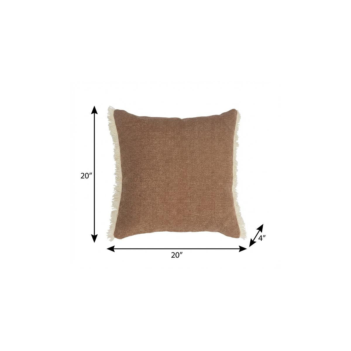 This 20-inch orange and tan cotton color block throw pillow with fringe will add a beautiful decorative accent to your decor. This orange and tan hued piece represents quality construction, expertly made from durable cotton that is not only long lasting but soft to the touch as well. This soft polyfill filled pillow not only is decorative but made to be comfy and cozy all day long. For anyone that loves to decorate or accent their space with color and texture. A great decorative accessory to add color and dimension to your favorite chair, accent your sofa, or to use as part of your bed ensemble. 20-inch h x 20-inch w x 4-inch d.