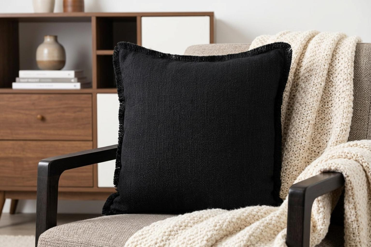 cotton throw pillow fringe, black cotton throw pillow fringe, throw pillow fringe, 20" black cotton throw pillow, cotton throw pillow |